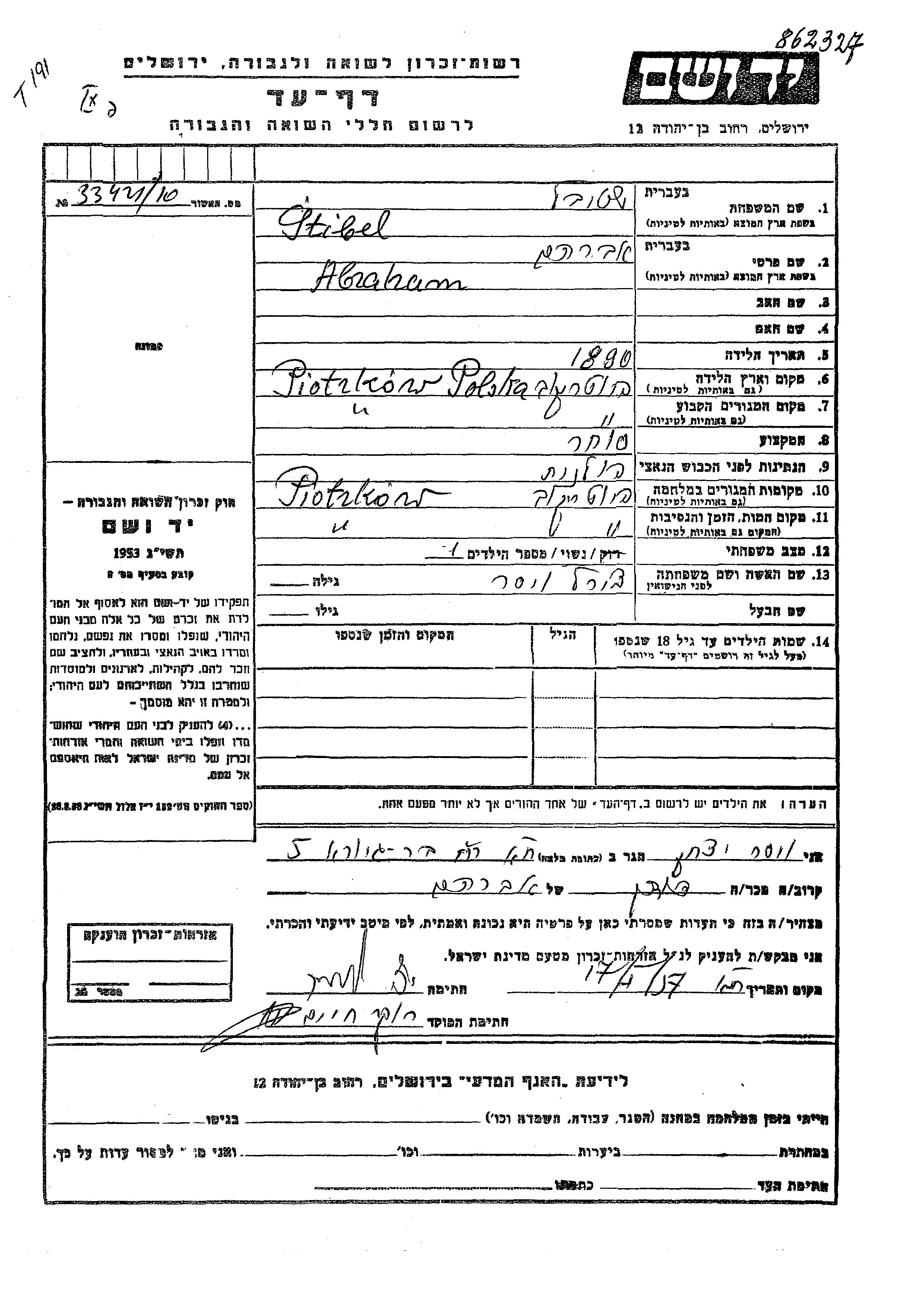 Стибель Абраам 1890 Пётркув, Польша Лист свидетельских показаний