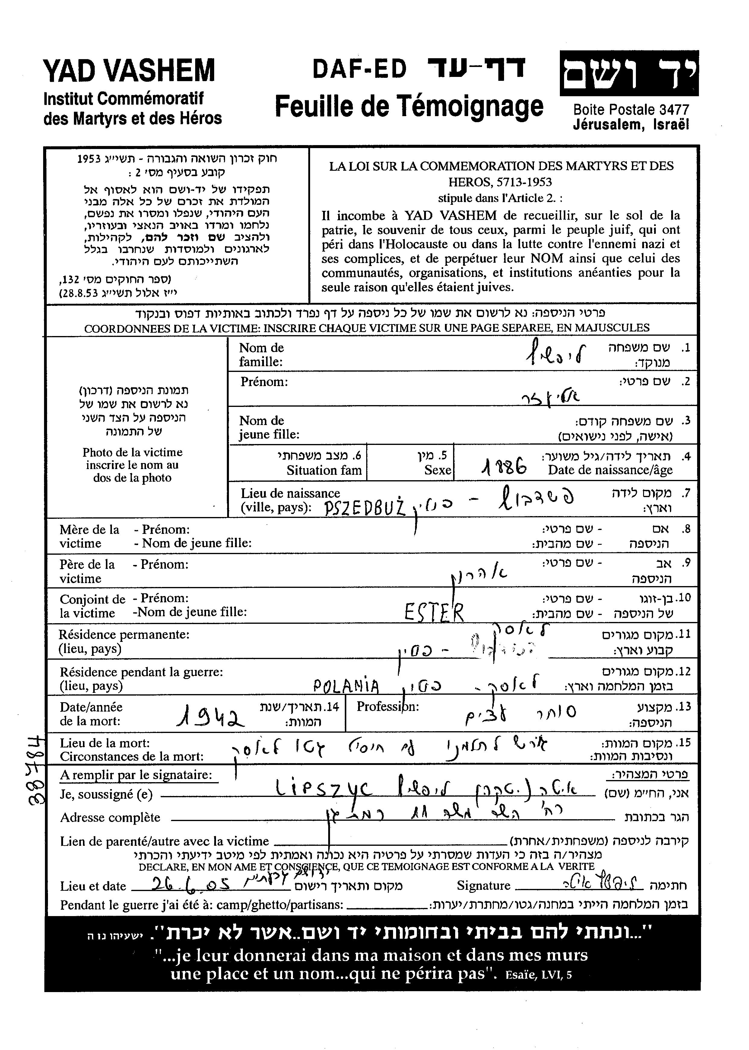 Элиэзер Липшиц, место рождения: Пшедбуш, Польша. Отец: Аарон. Лесоторговец. Место жительства до войны: Ласк, Польша. Место во время войны: Ласк, Польша.
