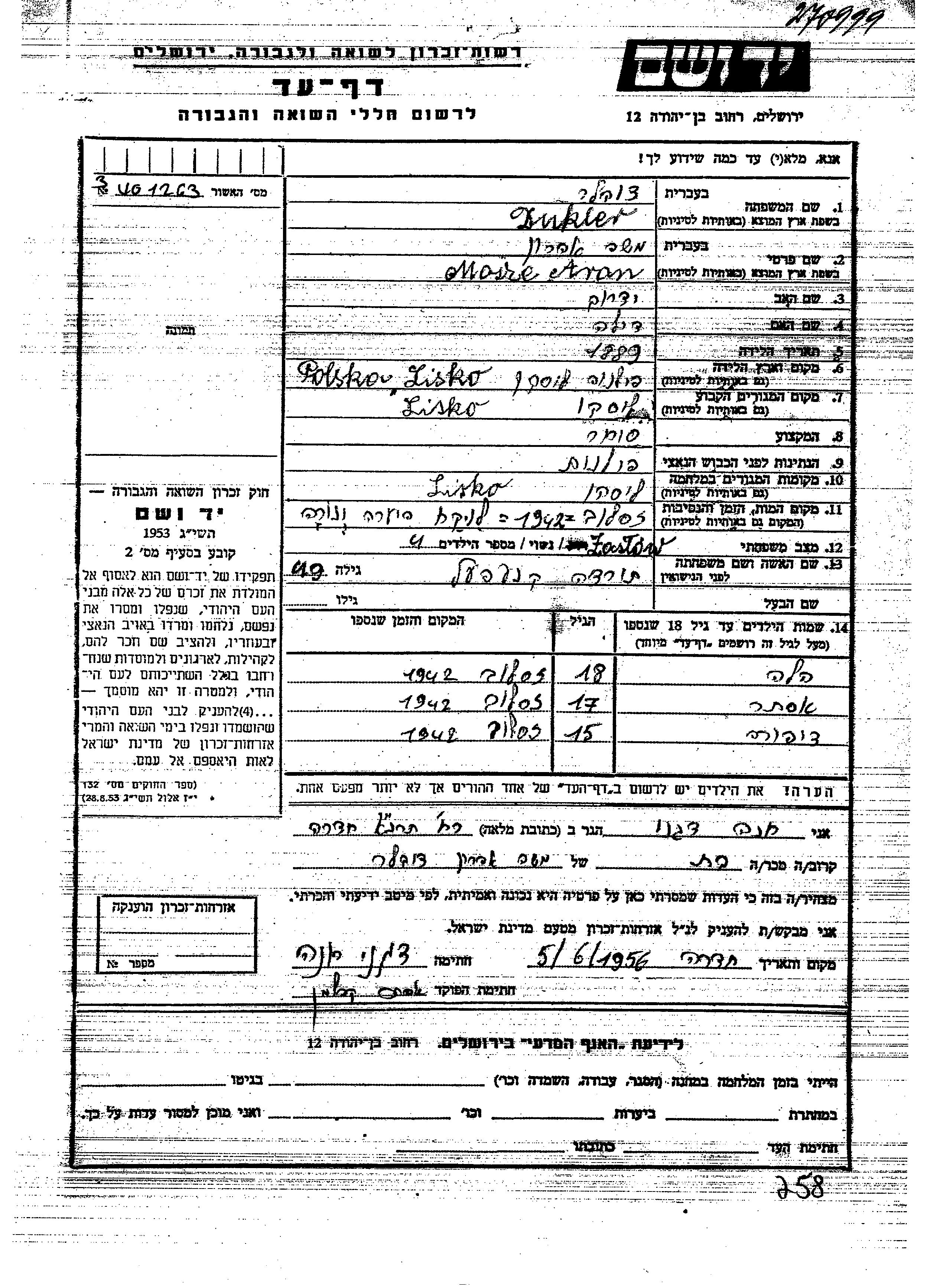 Моше Арон Дуклер, место рождения: Лиско, Польша. Отец: Ицхак, mать:Цила. Торговец / торговка. Женат / замужем. Место жительства до войны: Лиско, Польша. Место во время войны: Лиско, Польша.
