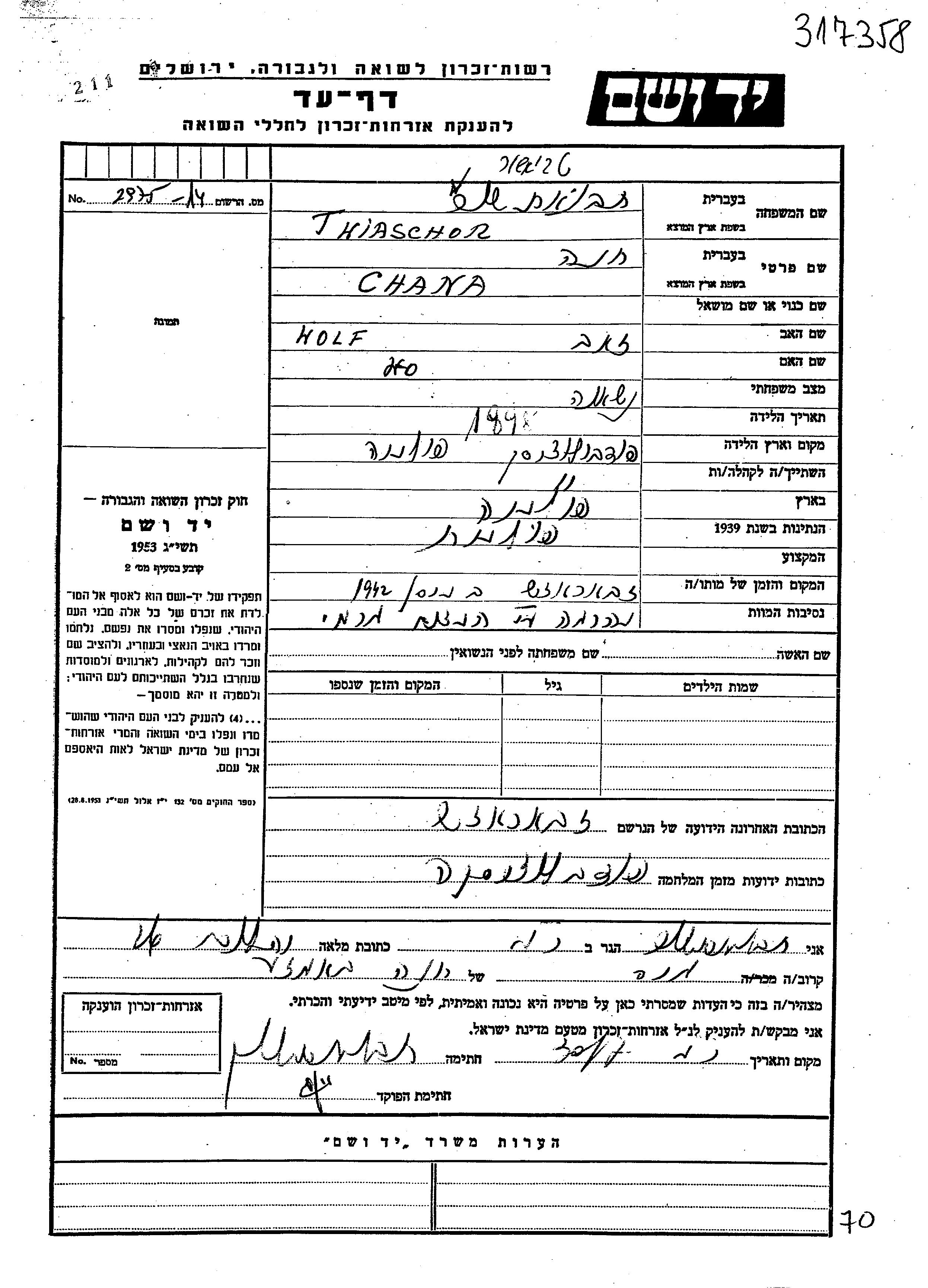 Хана Твиашор Твиешор, место рождения: Подволочиска, Польша. Отец: Вольф Зеев. Женат / замужем. Место жительства до войны: Подволочиска, Польша. Место во время войны: Збараж, Польша.