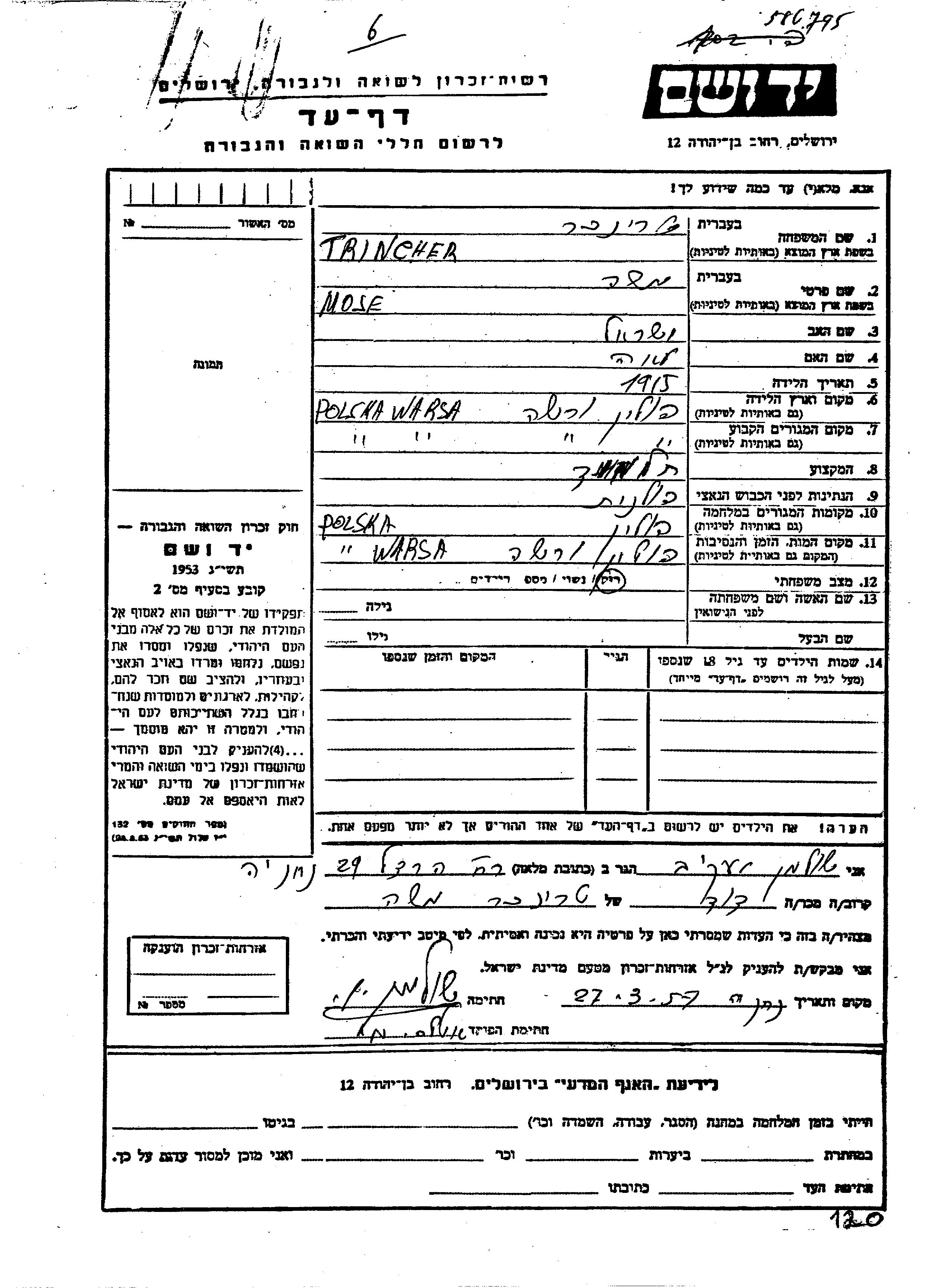 Моше Тринхер, место рождения: Варшава, Польша. Отец: Исраэль, mать:Лея. Студент / студентка. Холост / не замужем. Место жительства до войны: Варшава, Польша. Место во время войны: Варшава, Польша.