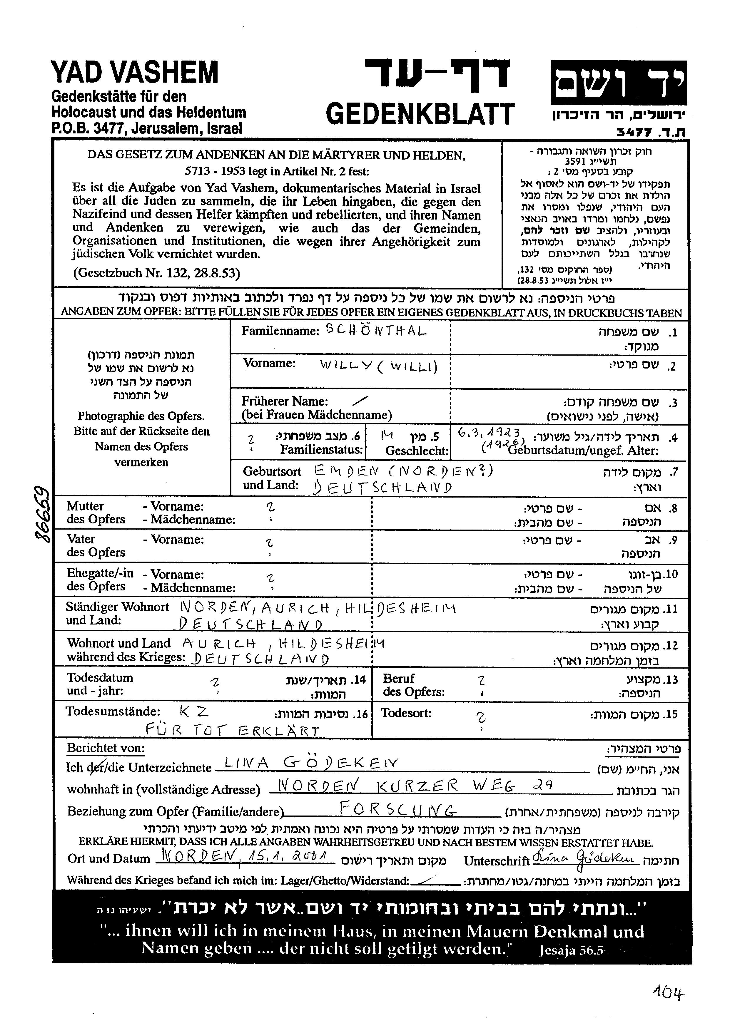 Вилли Шонталь, место рождения: Эмден, Германия. Место жительства до войны: Норден, Германия. Место во время войны: Аурих, Германия.