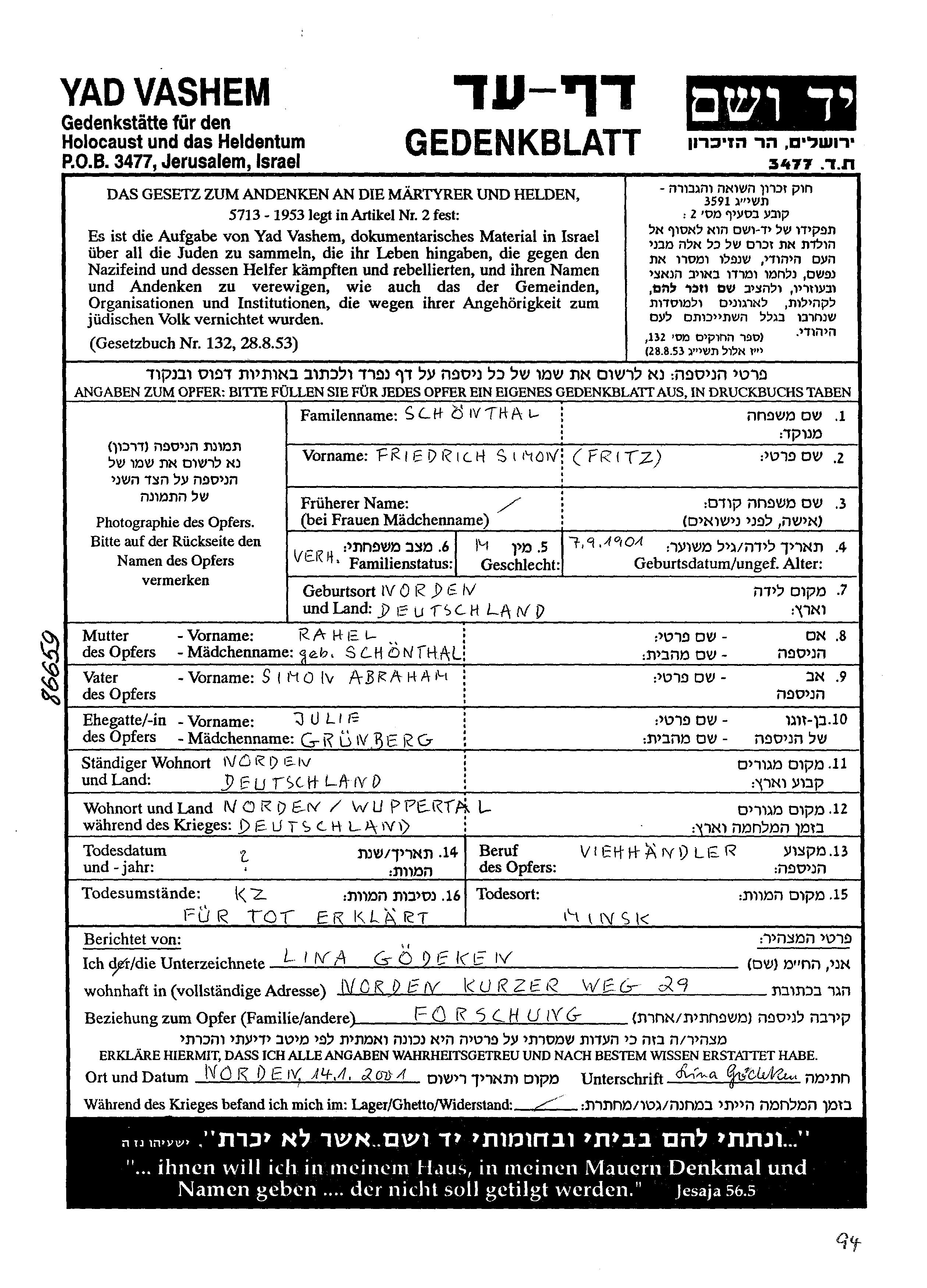 Фридрих Симон Шонталь, место рождения: Норден, Германия. Отец: Абраам Симон, mать:Рахель, девичья фамилия Шонталь. Скотопромышленник. Место жительства до войны: Норден, Германия. Место во время войны: Вупперталь, Германия.