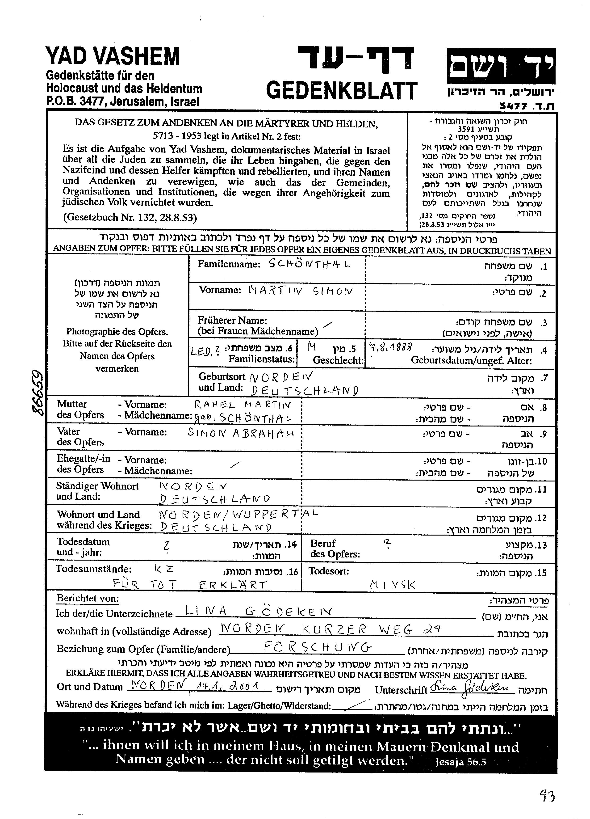 Мартин Симон Шонталь, место рождения: Норден, Германия. Отец: Абраам, mать:Рахель, девичья фамилия Шонталь. Холост / не замужем. Место жительства до войны: Норден, Германия. Место во время войны: Вупперталь, Германия.