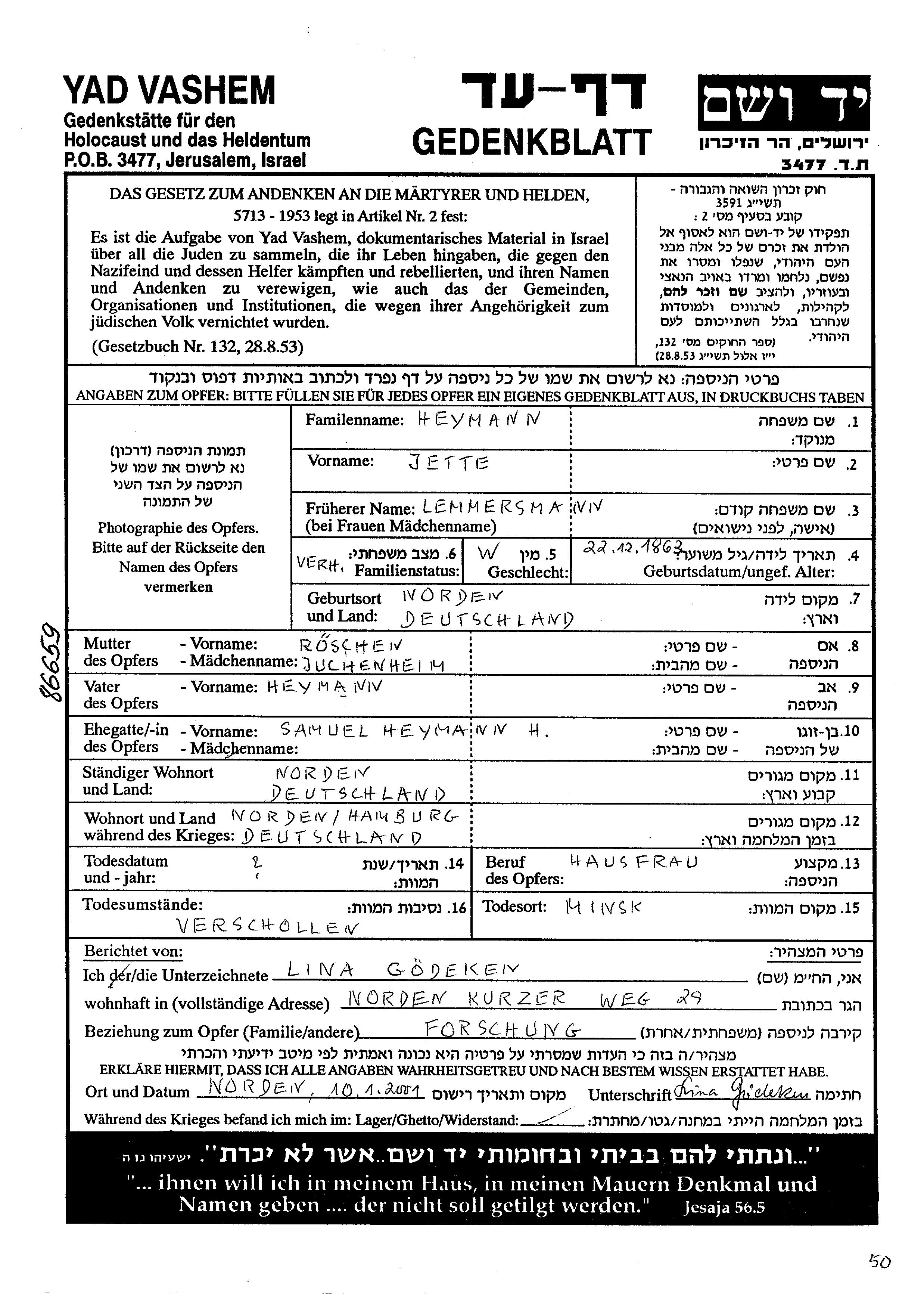 Етте Хейманн, девичья фамилия Леммерсманн, место рождения: Норден, Германия.Mать:Рёзхен, девичья фамилия Юхенхайм. Домохозяйка. Женат / замужем. Место жительства до войны: Норден, Германия. Место во время войны: Гамбург, Германия.