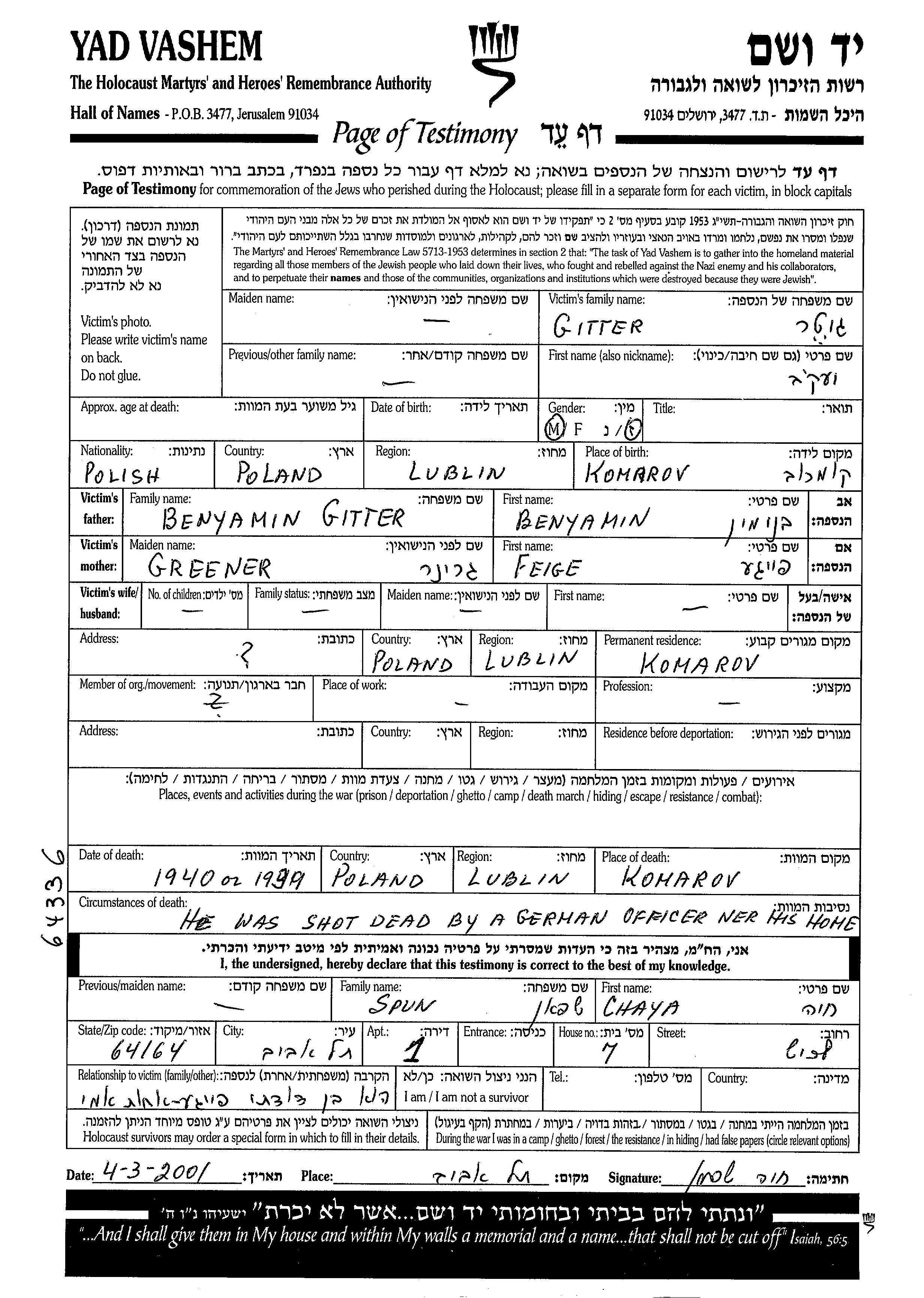 Яков Гиттер, место рождения: Комаров, Польша. Отец: Беньямин, mать:Файге, девичья фамилия Гринер. Место жительства до войны: Комаров, Польша.
