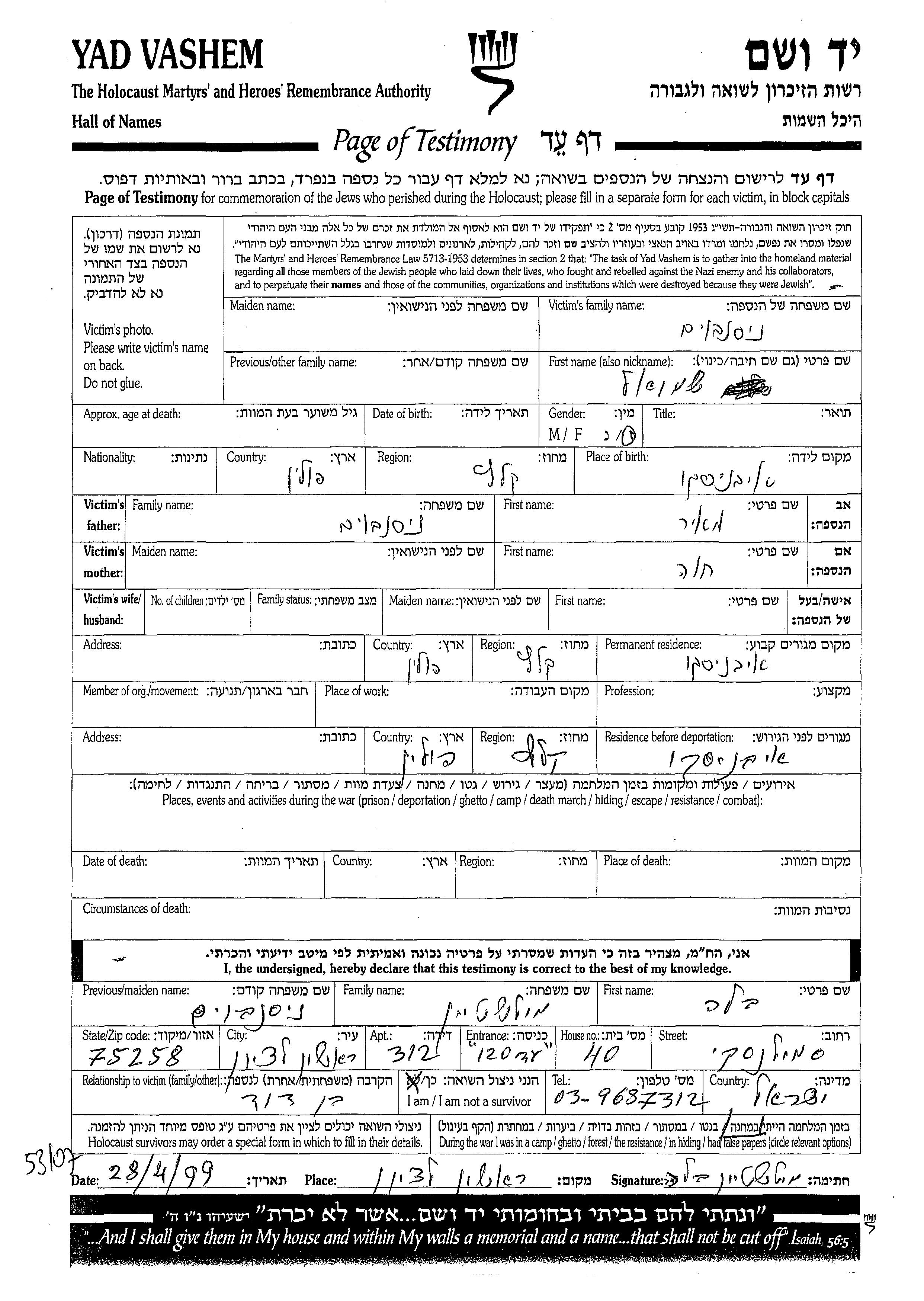 Нисенбойм Шмуэль Иваниско, Польша Лист свидетельских показаний