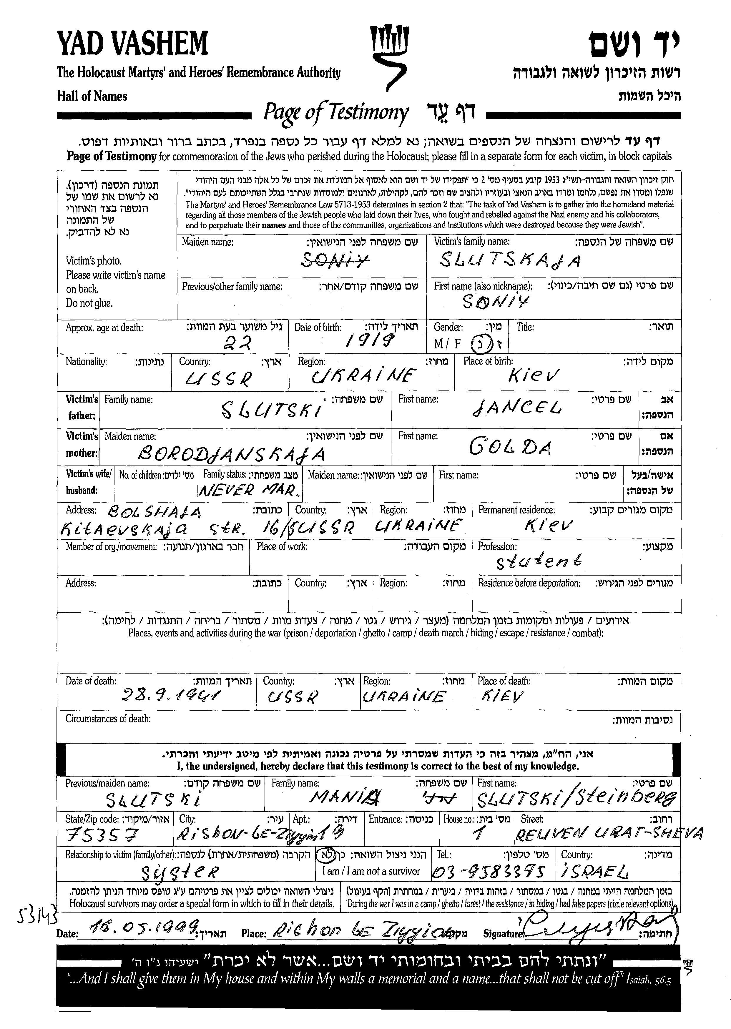 Соний Слуцкая, место рождения: Киев, Украина (СССР). Отец: Яков, mать:Голда, девичья фамилия Бородянская. Студент / студентка. Холост / не замужем. Место жительства до войны: Киев, Украина (СССР). Место во время войны: Киев, Украина (СССР).