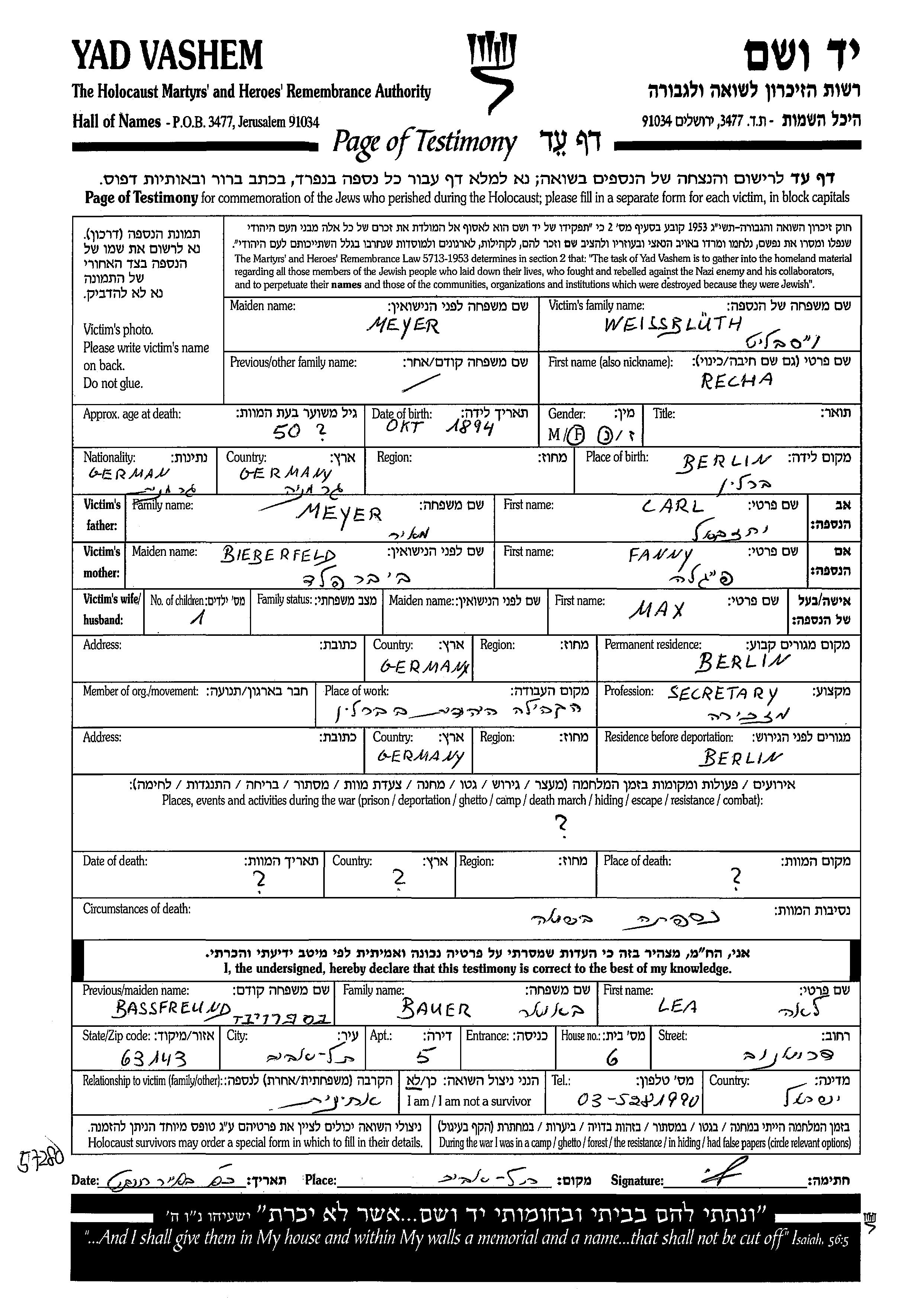 Реха Вейсблит Вейссблут, девичья фамилия Мейер, место рождения: Берлин, Германия. Отец: Иехезкель Карл, mать:Фанни Фейгеле, девичья фамилия Биберфельд. Секретарь. Женат / замужем. Место жительства до войны: Берлин, Германия. Место во время войны: Берлин, Германия.