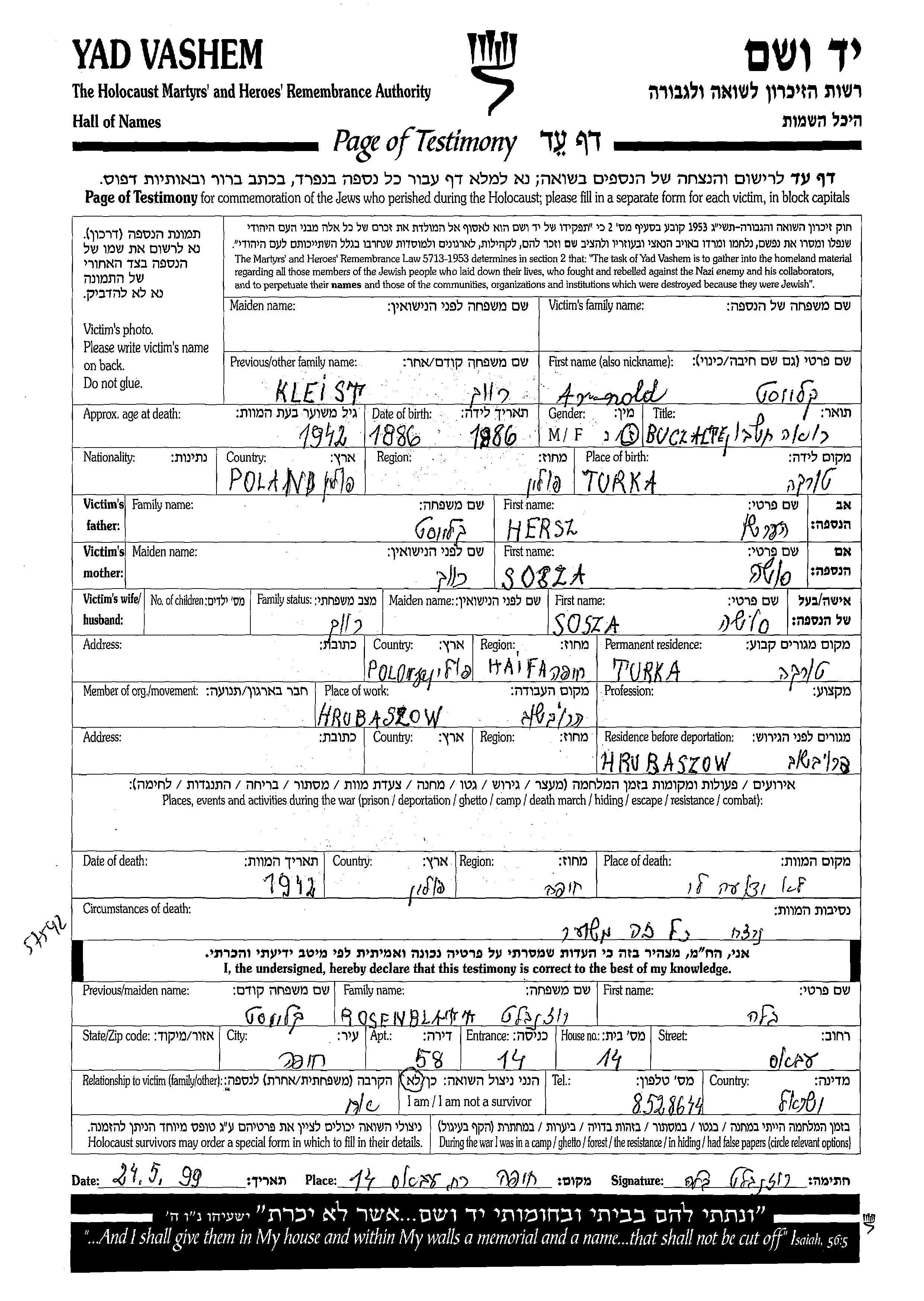 Арнольд Клейст, место рождения: Турка, Польша. Отец: Герш, mать:Соша. Бухгалтер. Холост / не замужем. Место жительства до войны: Турка, Польша. Место во время войны: Хрубешув, Польша.