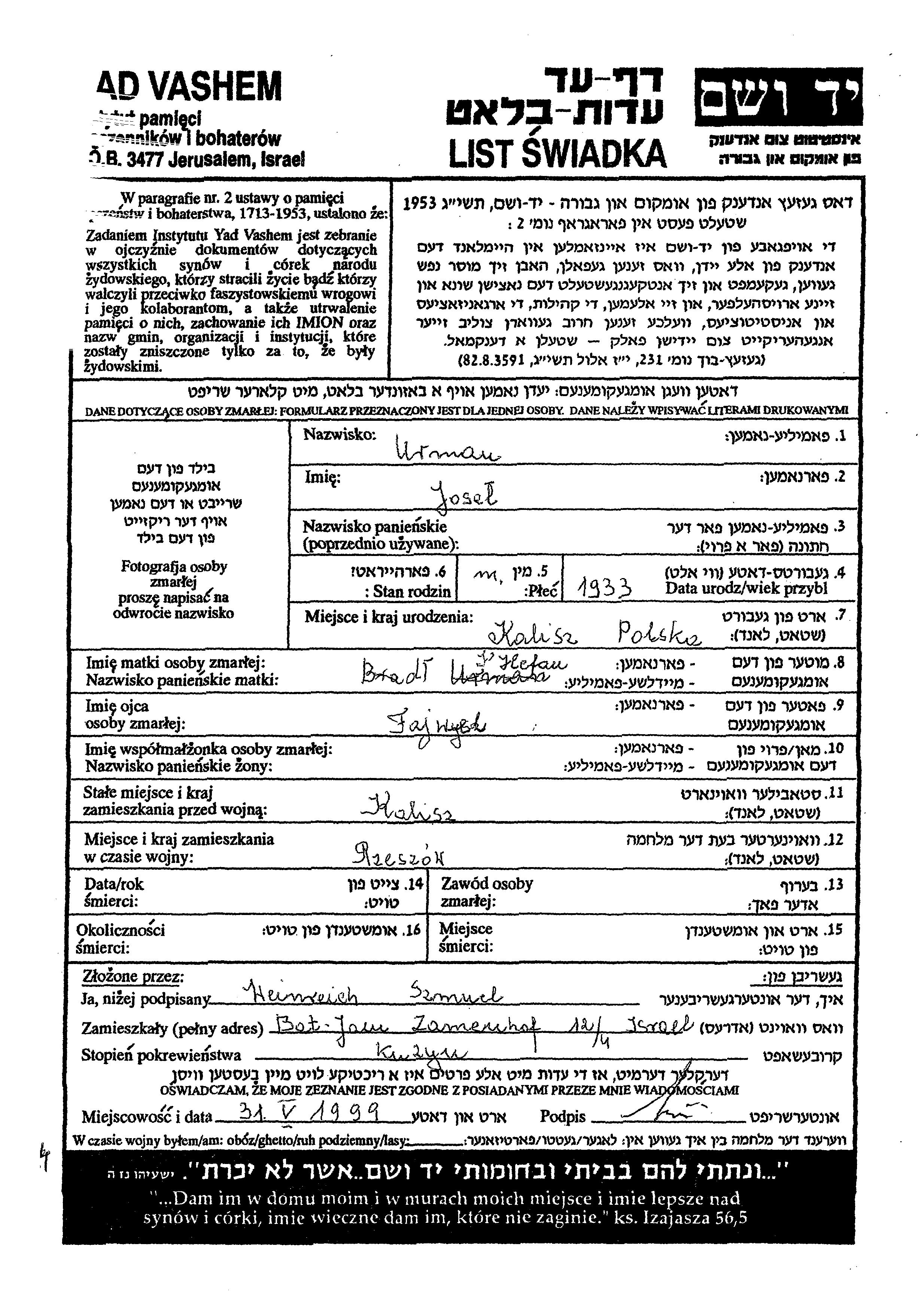 Йосел Урман, место рождения: Калиш, Польша. Отец: Файвел, mать:Брадл, девичья фамилия Хельфан. Место жительства до войны: Калиш, Польша. Место во время войны: Жешув, Польша.