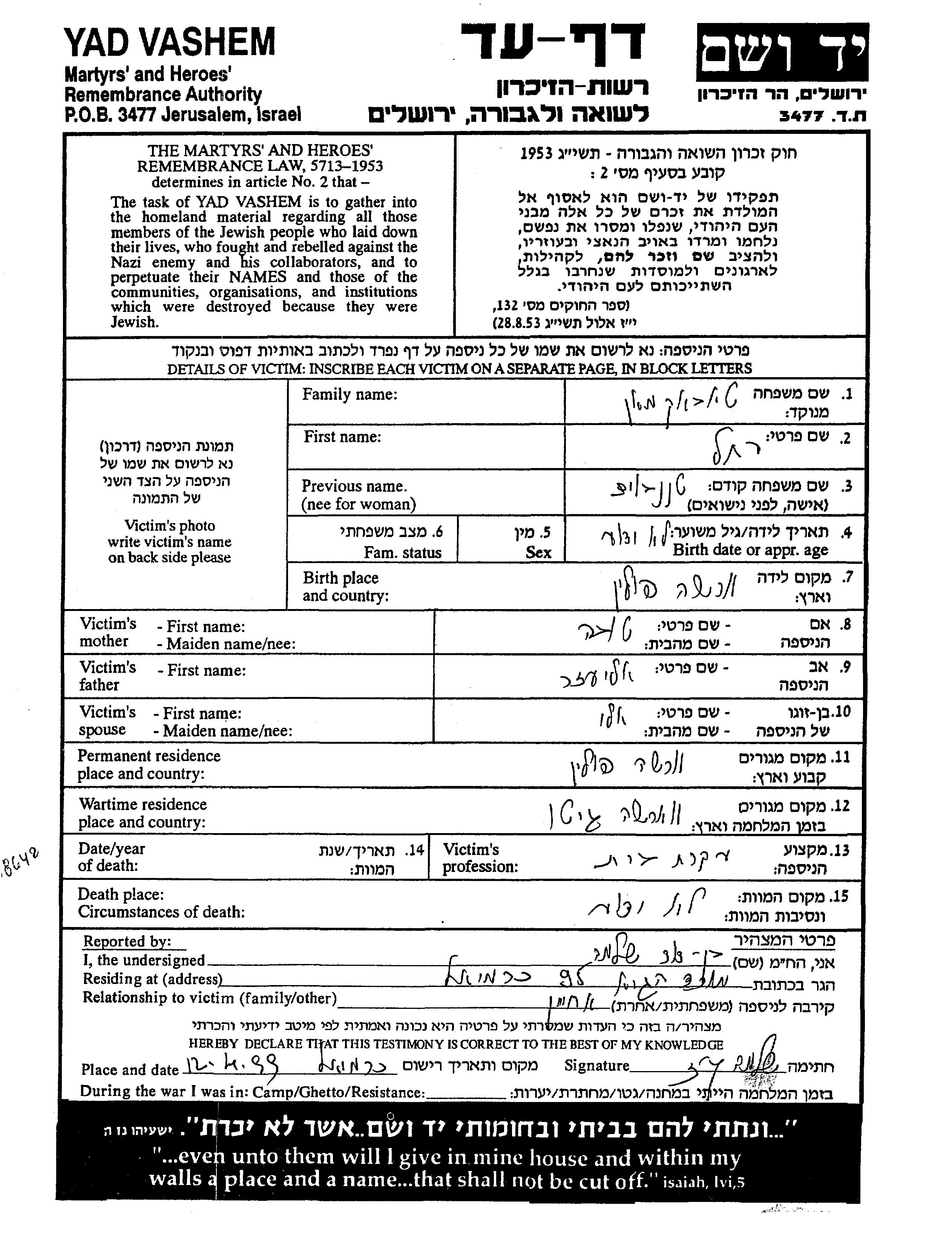 Яд Вашем - Листы свидетельских показаний Мемориального фонда
