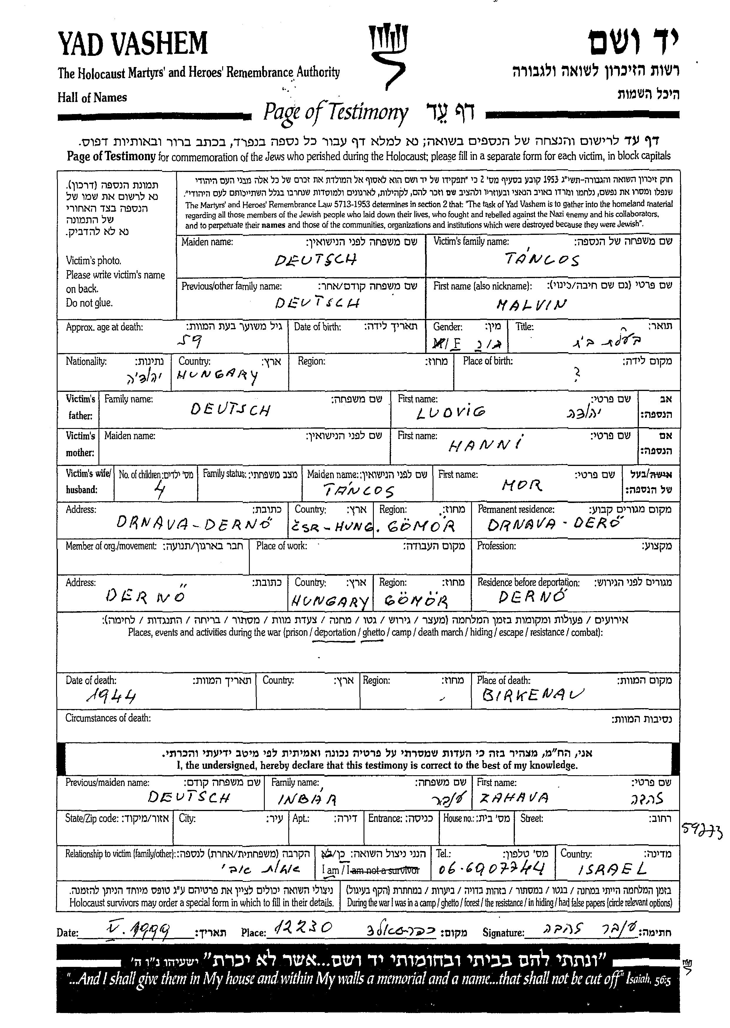 Мальвин Танцош, девичья фамилия Дойч, место рождения: Венгрия. Отец: Людвиг, mать:Ханни. Женат / замужем. Место жительства до войны: Дрнава, Чехословакия. Место во время войны: Дернё, Чехословакия.