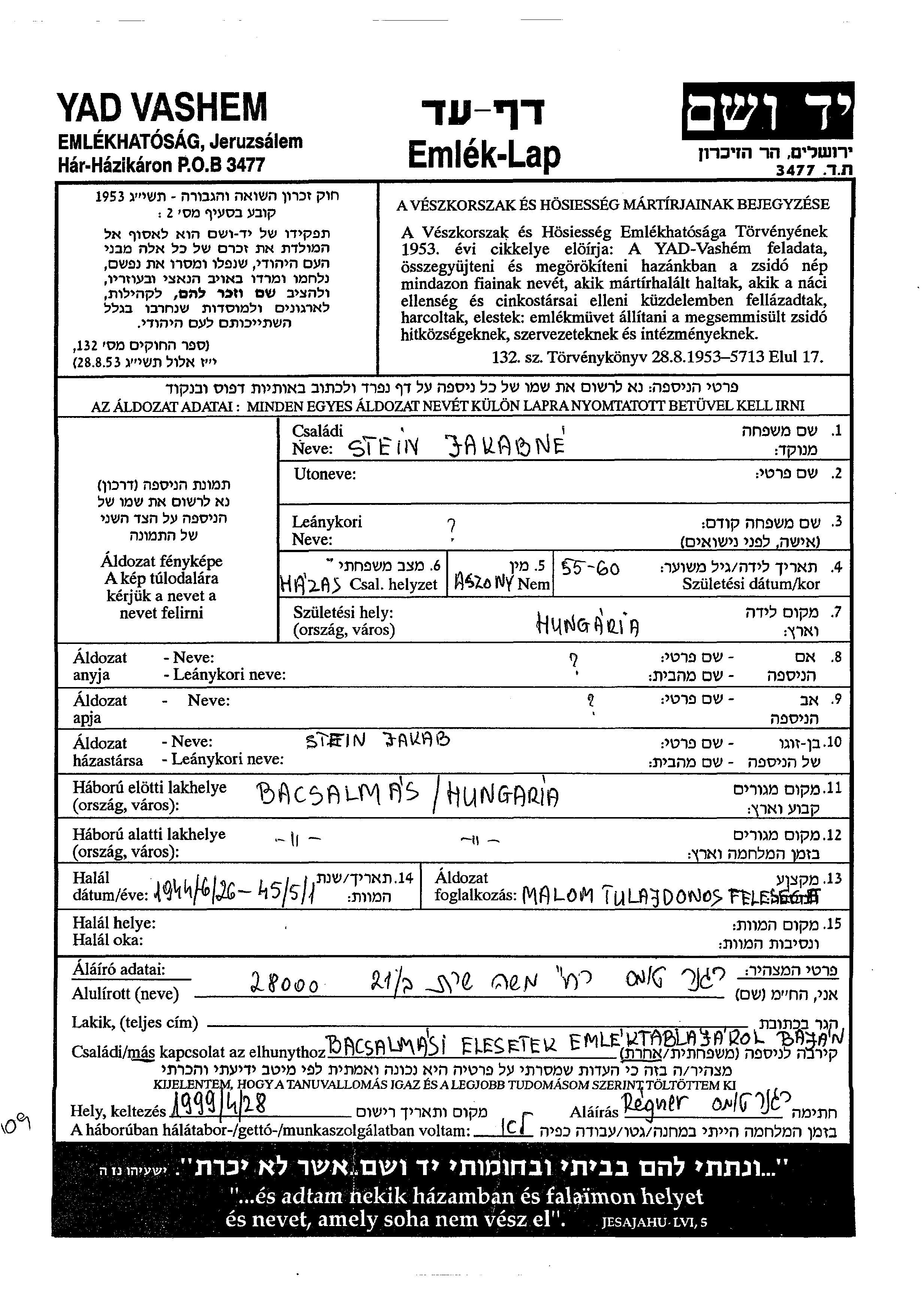 Имя неизвестно Штайн, место рождения: Венгрия. Женат / замужем. Место жительства до войны: Бачальмаш, Венгрия. Место во время войны: Бачальмаш, Венгрия.