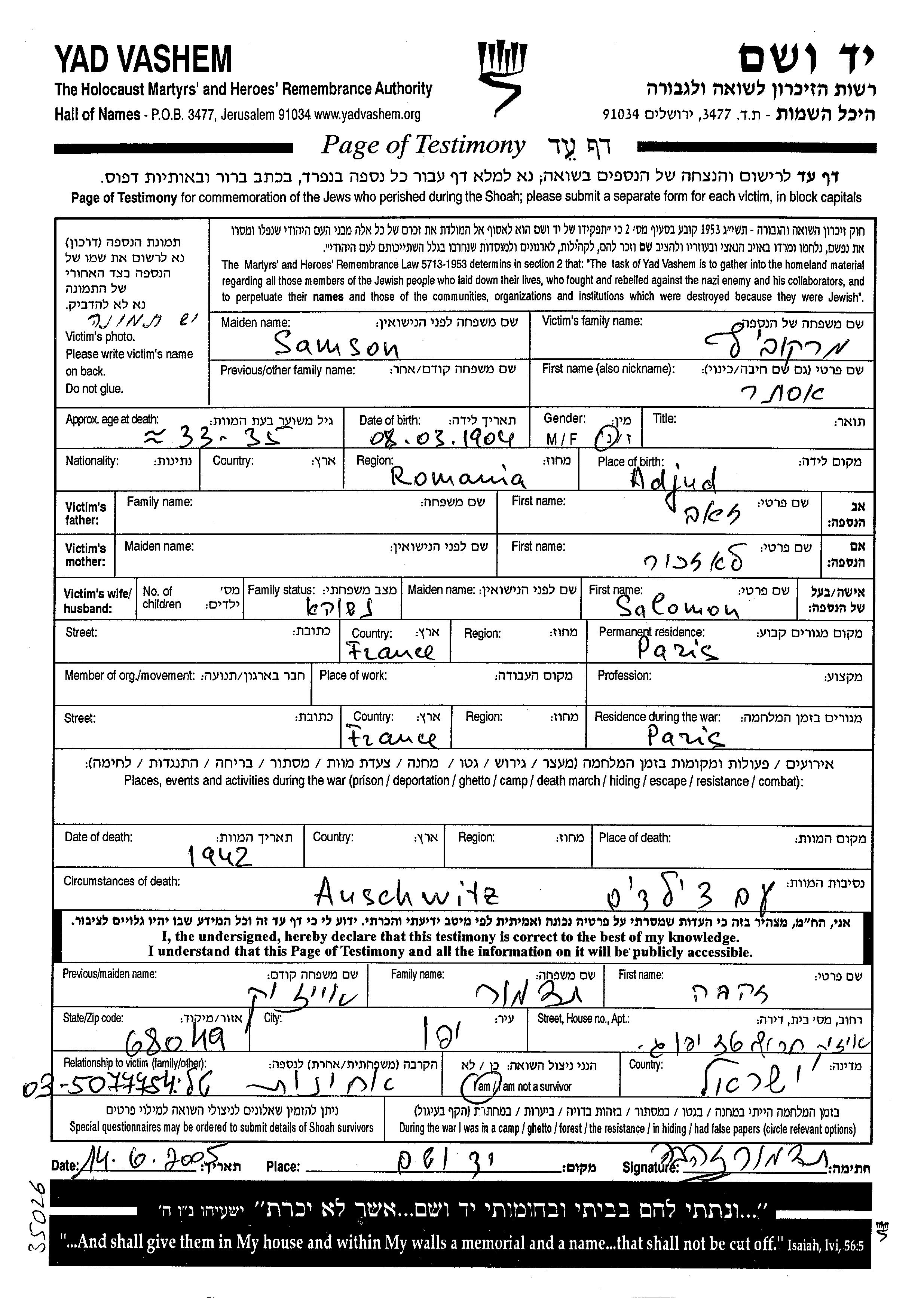 Эстер Марковиц, девичья фамилия Самсон, место рождения: Аджуд, Румыния. Отец: Зеев. Женат / замужем. Место жительства до войны: Париж, Франция. Место во время войны: Париж, Франция.