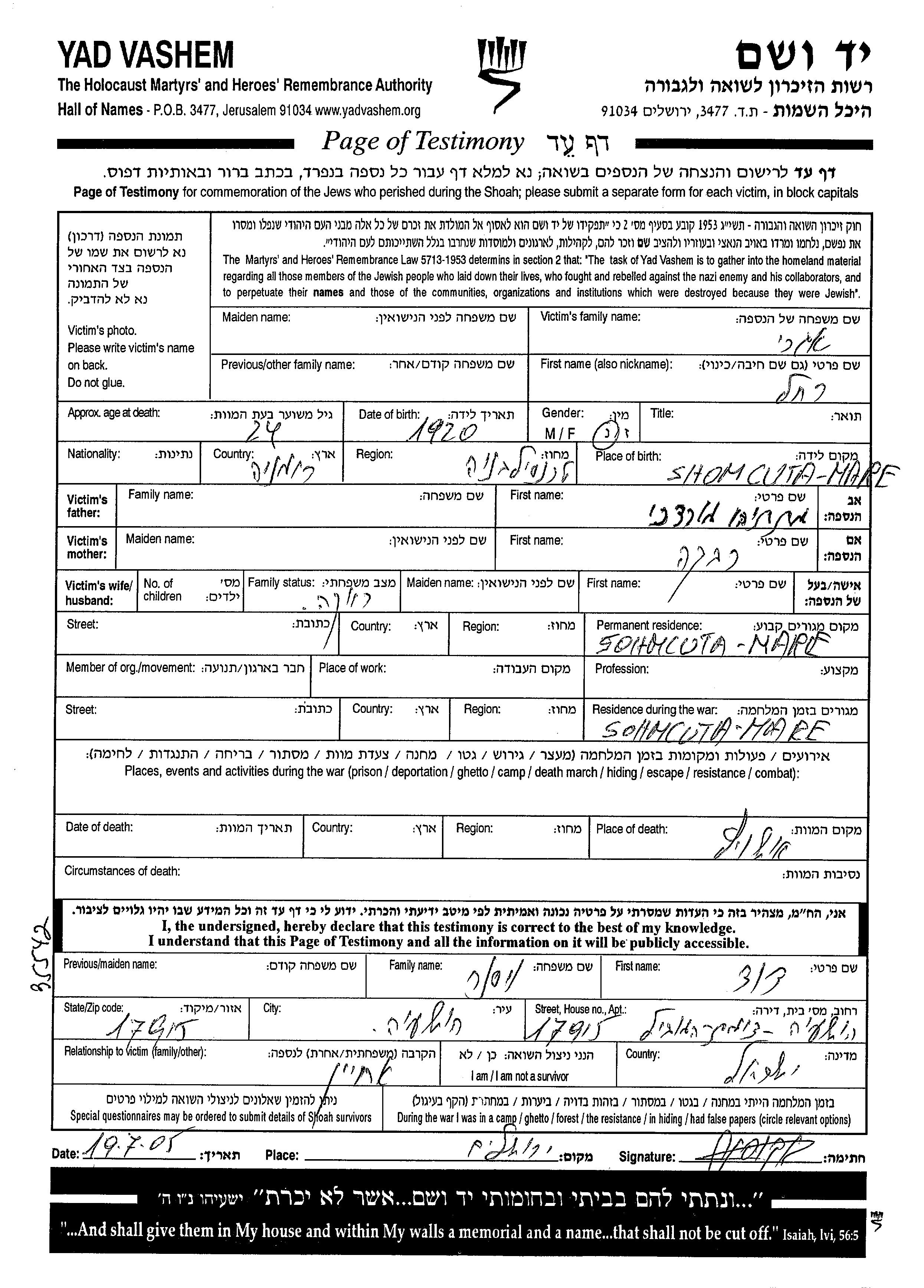 Яд Вашем - Листы свидетельских показаний Мемориального фонда