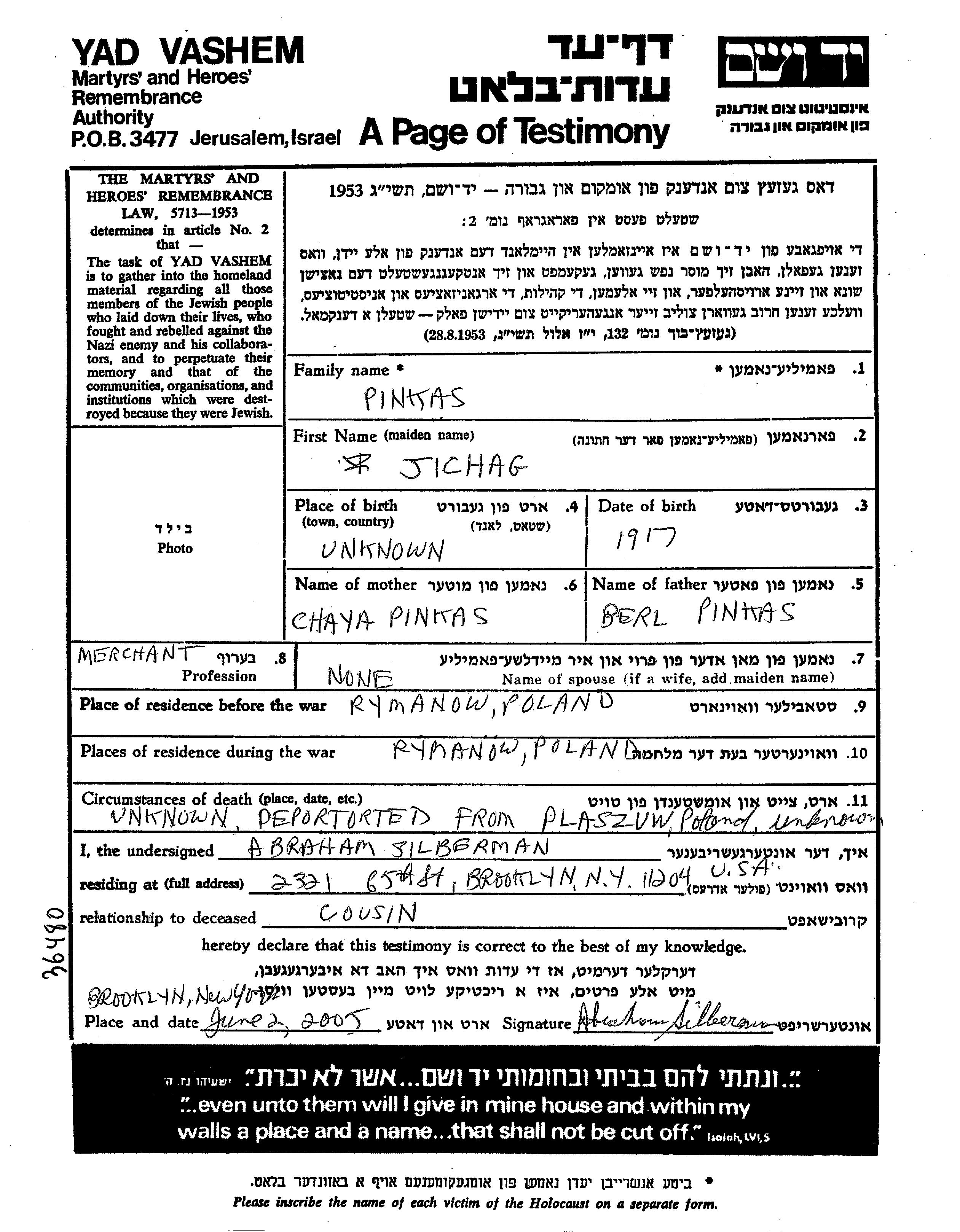 Пинкас Ицхаг 1917 Рыманув, Польша Лист свидетельских показаний
