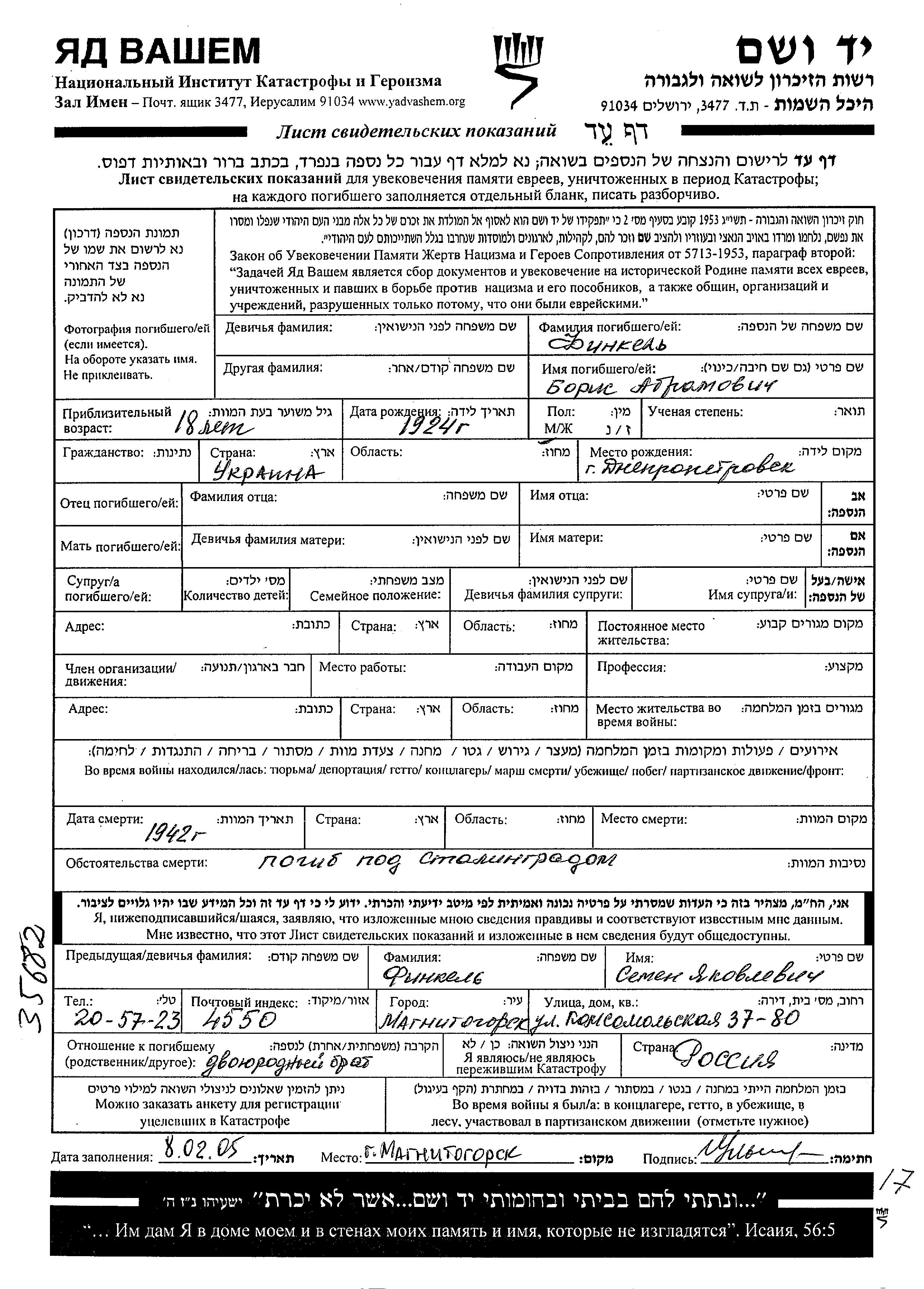 Финкель Борис 1924 место не указано, Лист свидетельских показаний