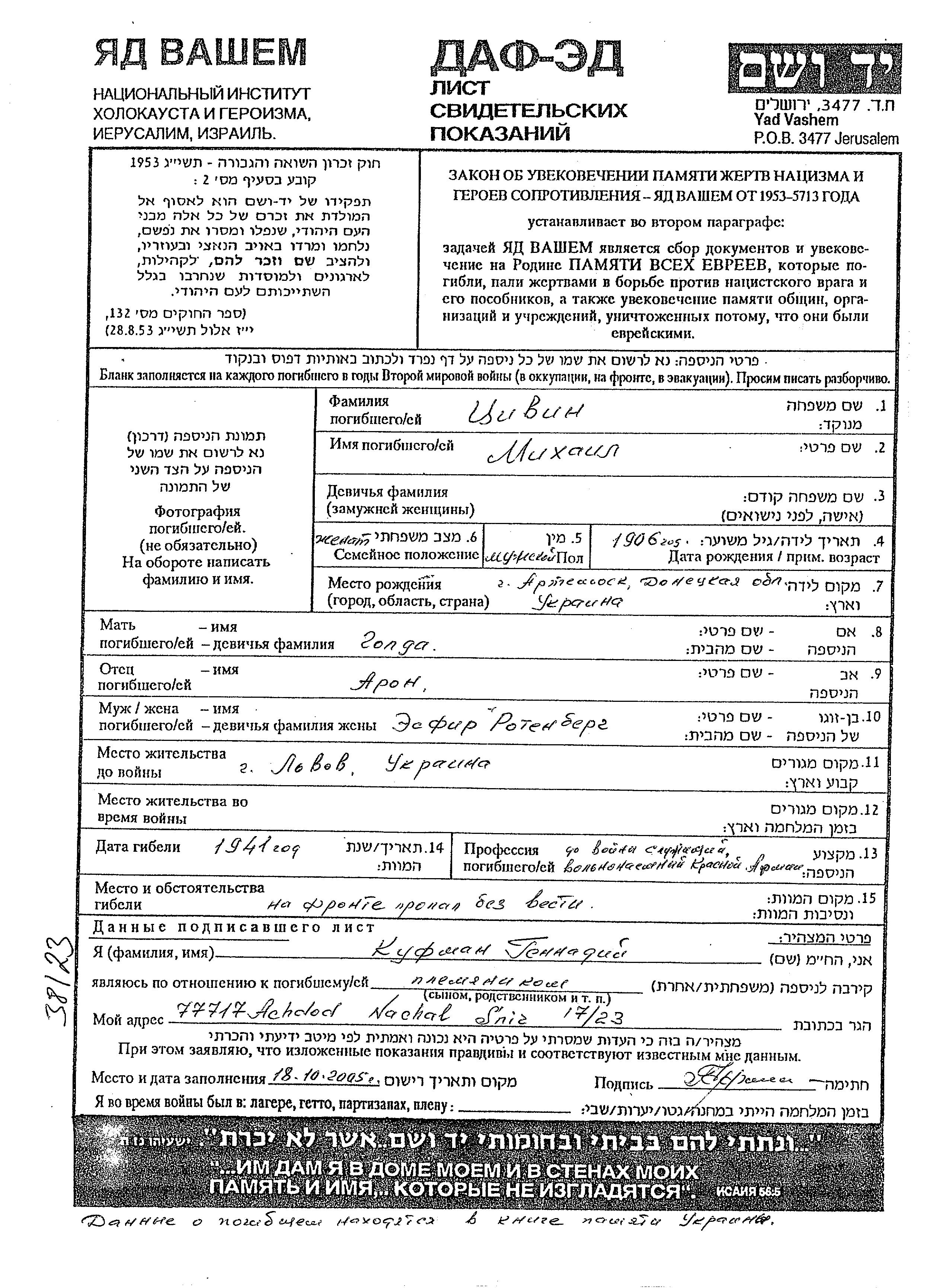 Михаил Цивин, место рождения: Артёмовск, Украина (СССР). Отец: Арон, mать:Голда. Служащий / служащая. Женат / замужем. Место жительства до войны: Львов, Польша.