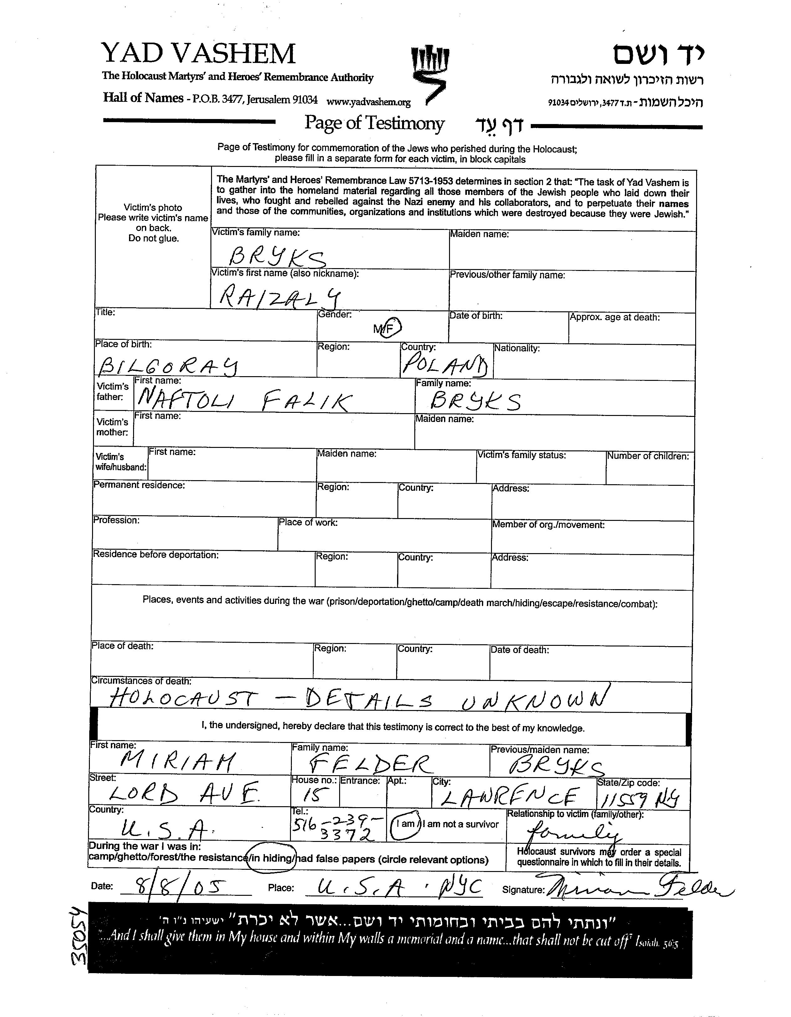Raizaly Брикс, место рождения: Билгорай, Польша. Отец: Нафтоли Фалик.