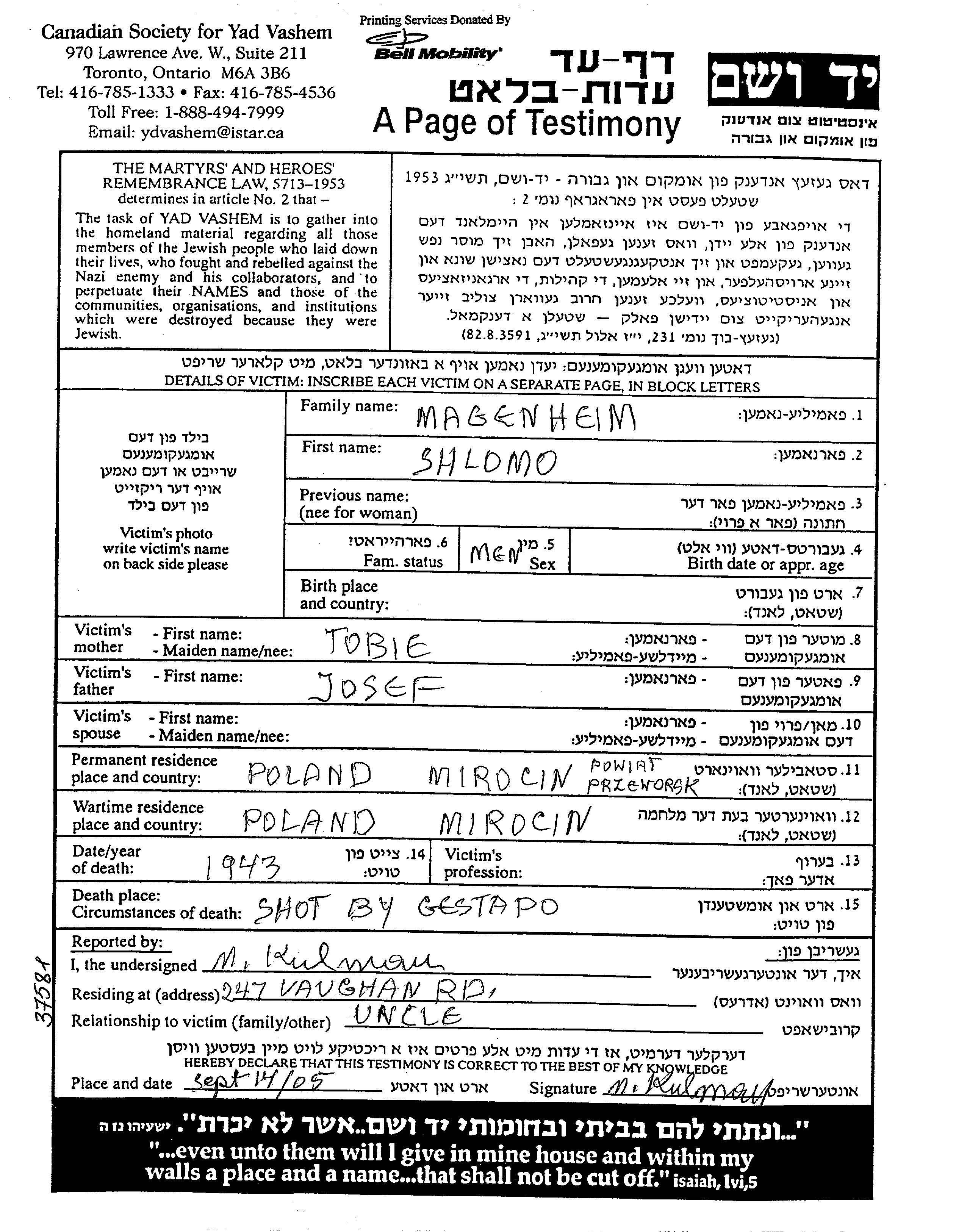 Шломо Магенхейм Йосеф Тобе. Место жительства до войны: Powiatowka, Польша. Место во время войны: Mirocin, Польша.