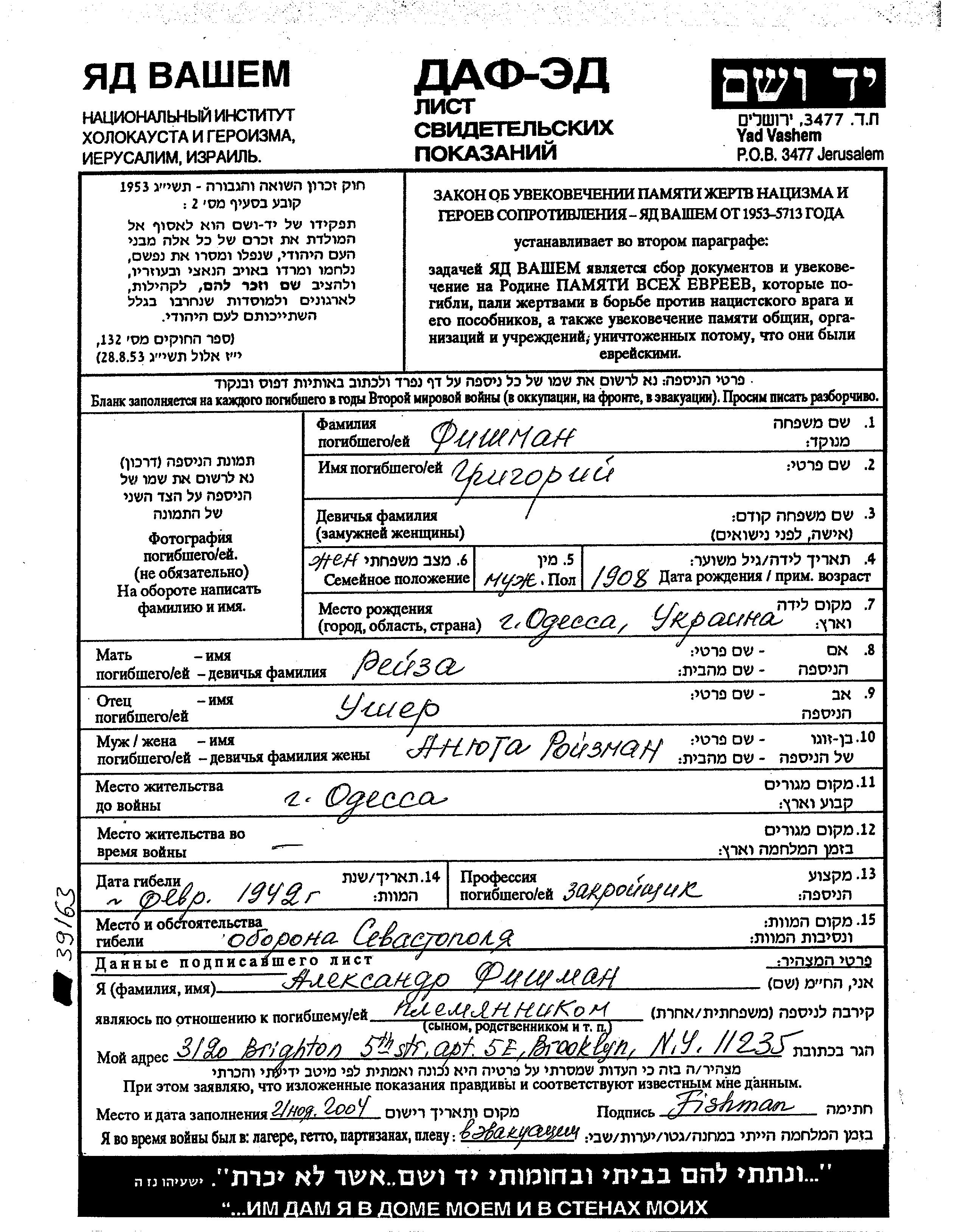 Фишман Григорий 1908 Одесса, Украина (СССР) Лист свидетельских показаний