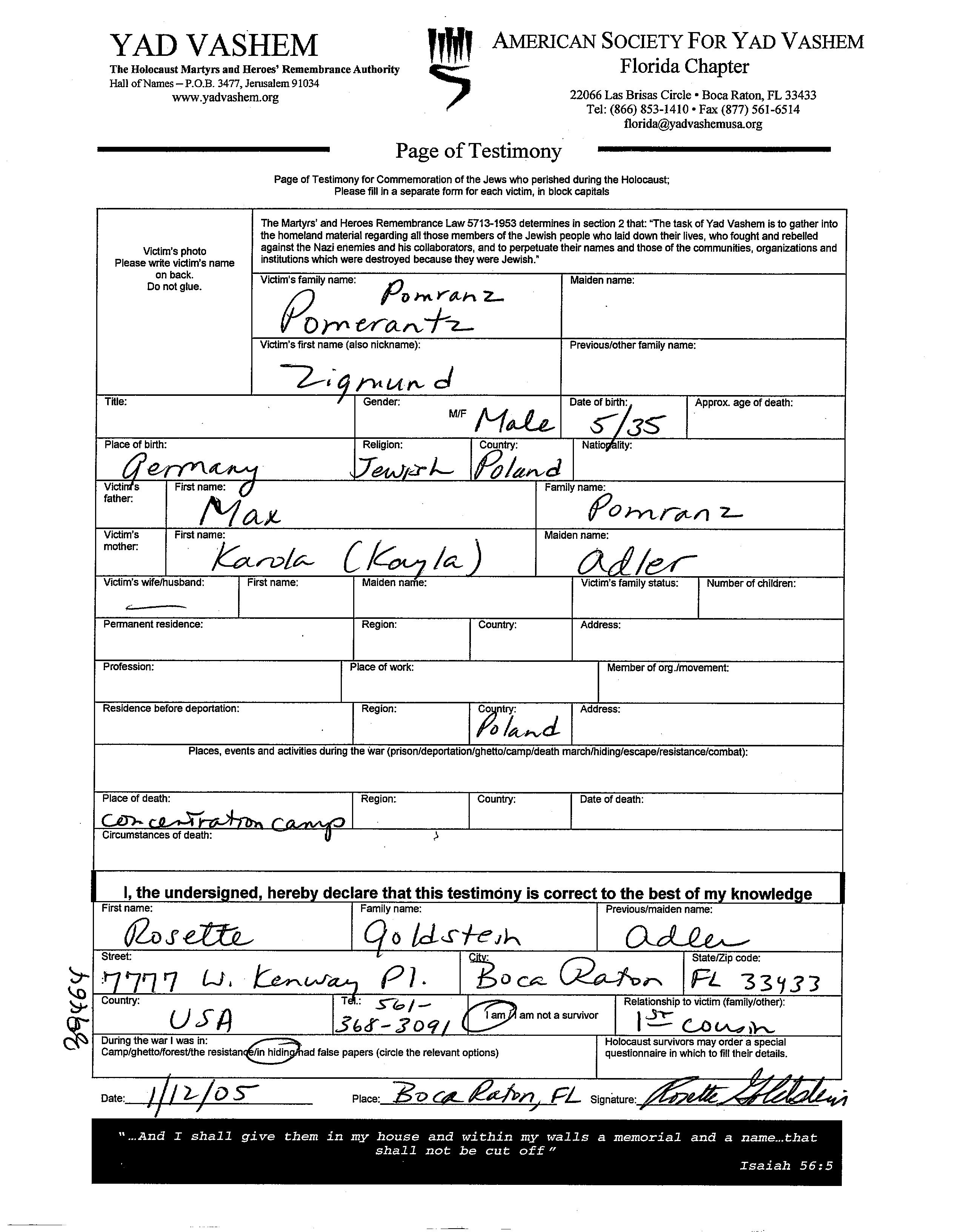 Зигмунд Помранц. Отец: Макс, mать:Карола Кайла, девичья фамилия Адлер. Ребенок.