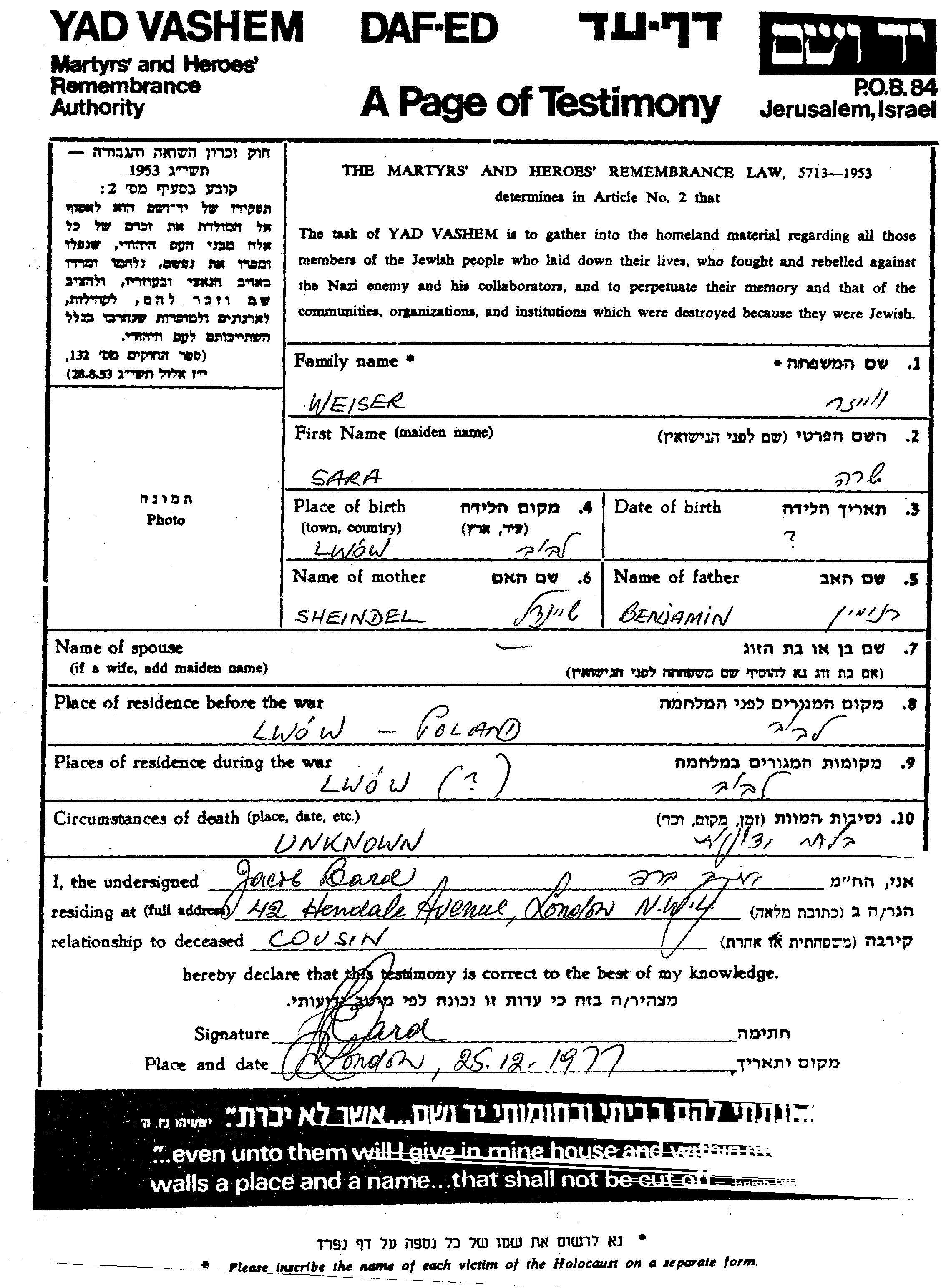 Сара Вайзер, место рождения: Львов, Польша. Отец: Беньямин, mать:Шейндель. Место жительства до войны: Львов, Польша. Место во время войны: Львов, Польша.