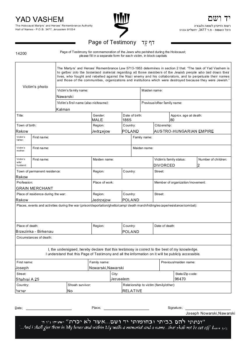 Наварски Кальман 1865 Раков, Польша Лист свидетельских показаний (электронный)