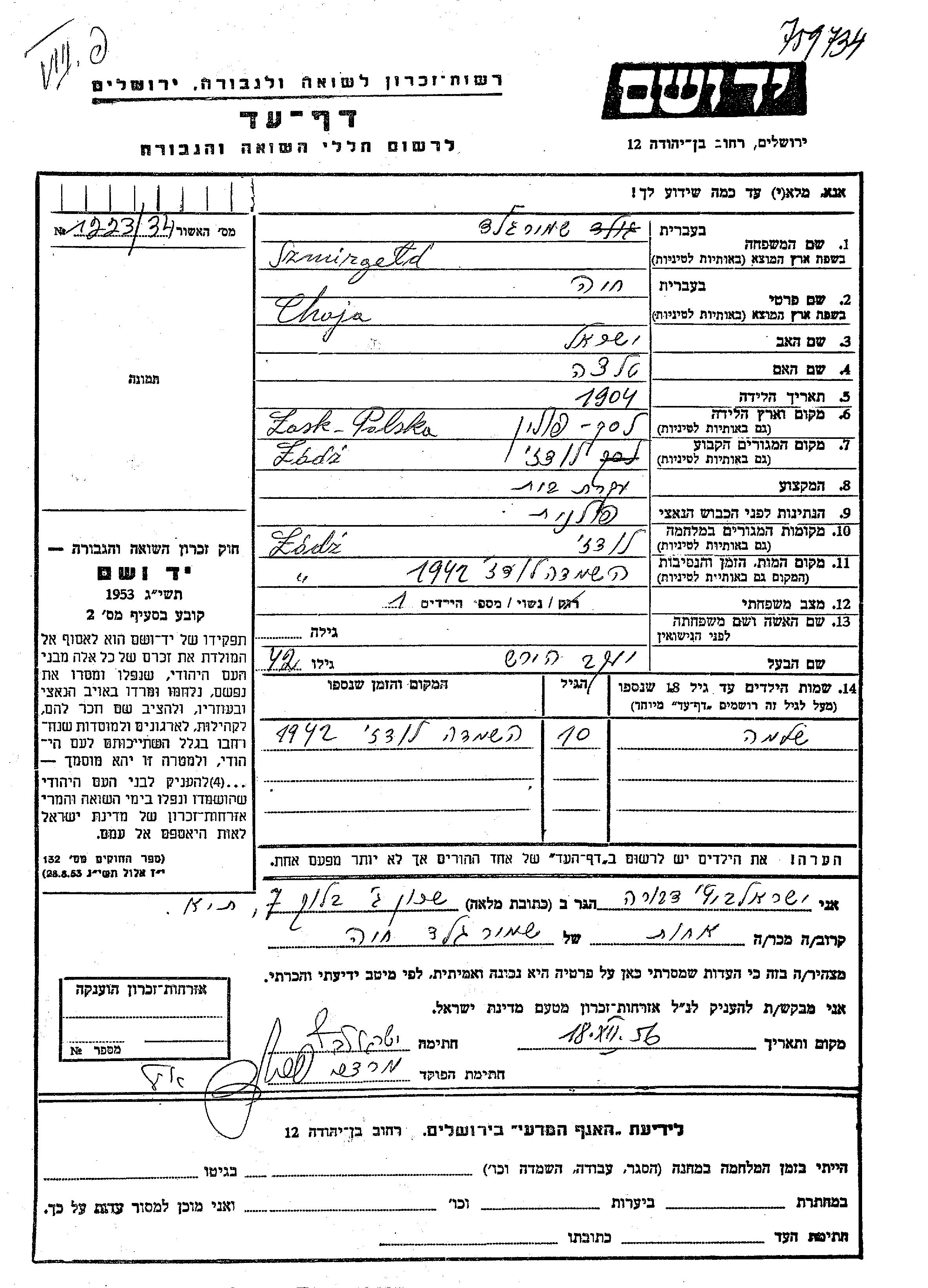 Шмиргельд Хая 1904 Лодзь, Польша Лист свидетельских показаний