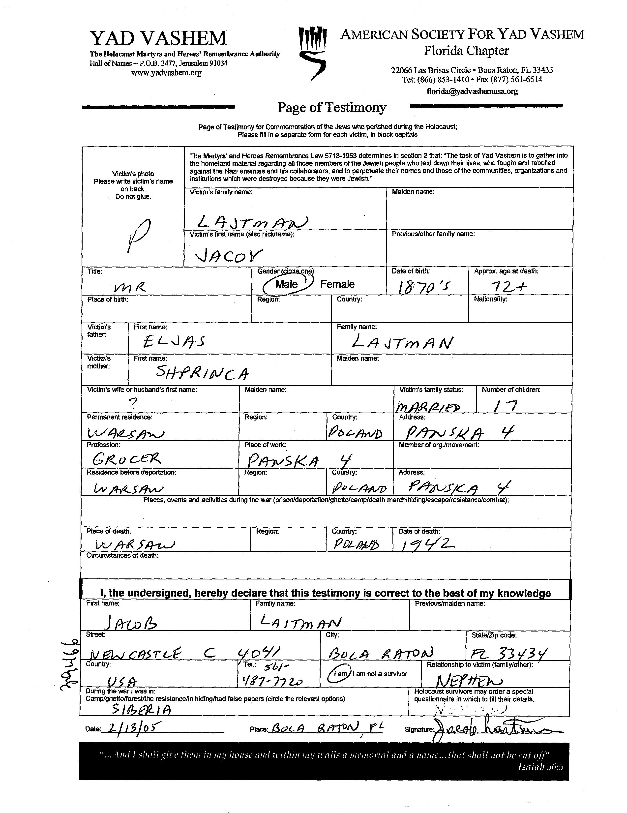 Яков Лайтман. Отец: Эльяс, mать:Шпринца. Бакалейщица. Женат / замужем. Место жительства до войны: Варшава, Польша. Место во время войны: Варшава, Польша.