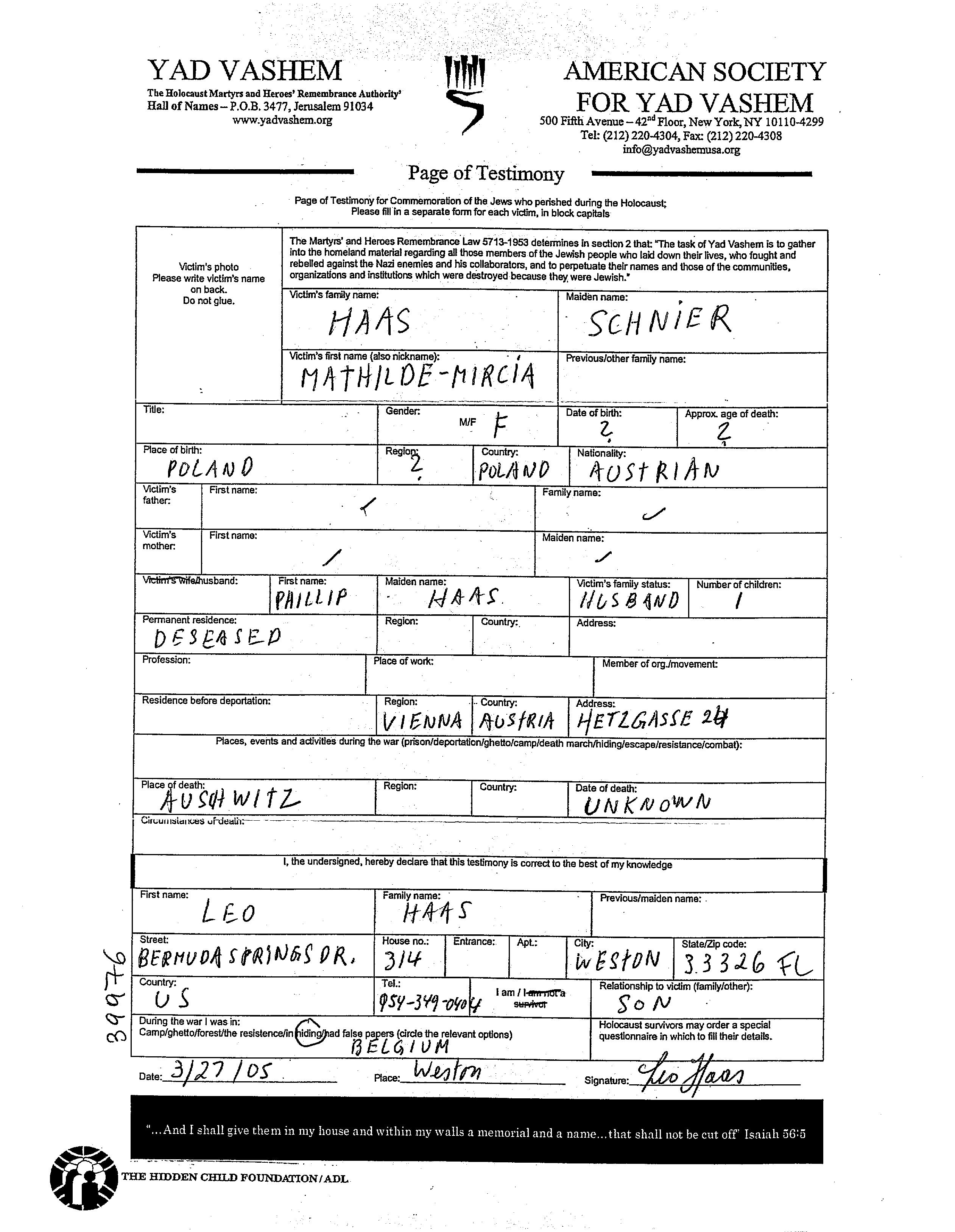 Хаас Мирча Матильде место не указано, Лист свидетельских показаний