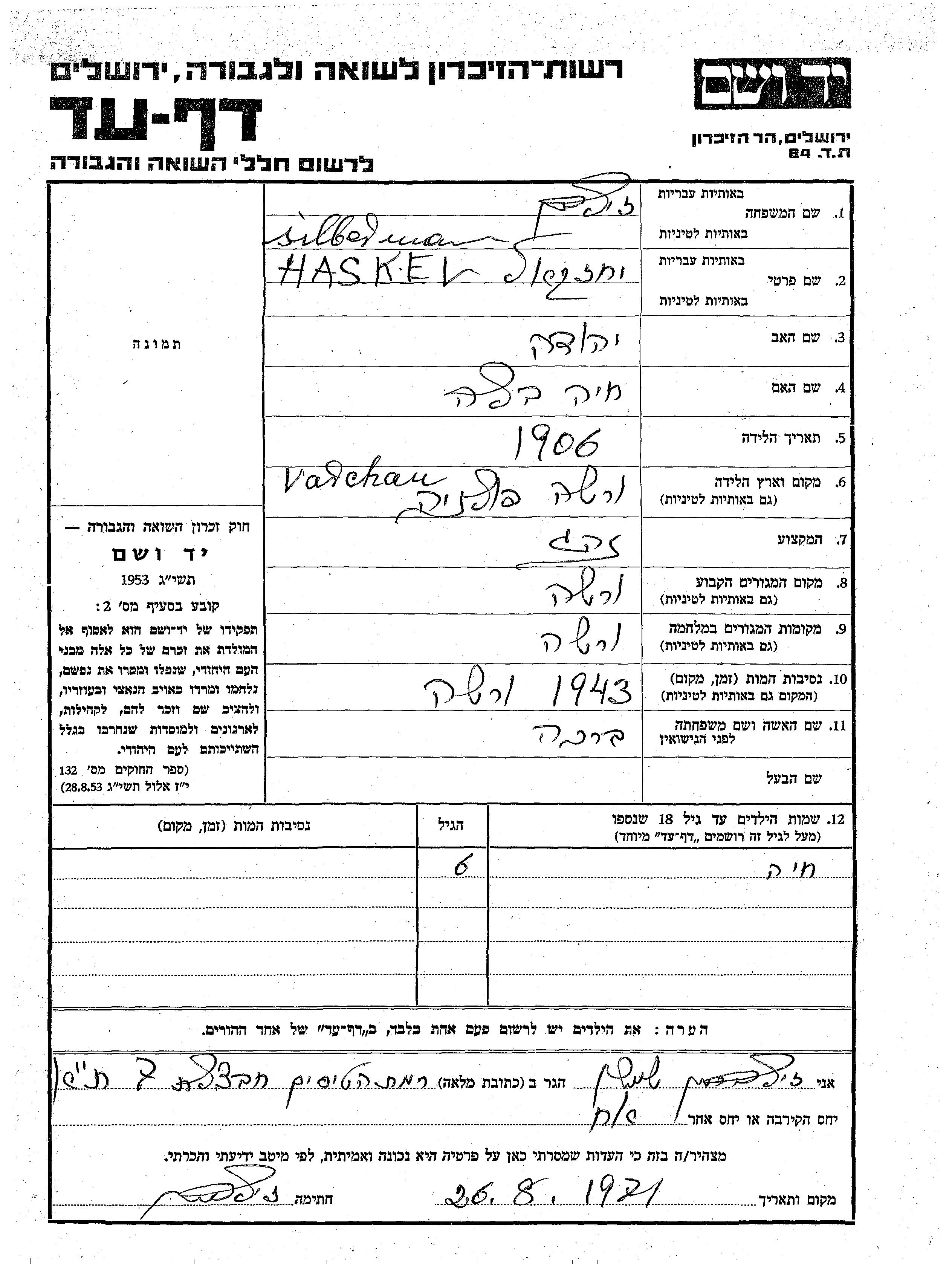 Зильберман Хаскель 1906 Варшава, Польша Лист свидетельских показаний