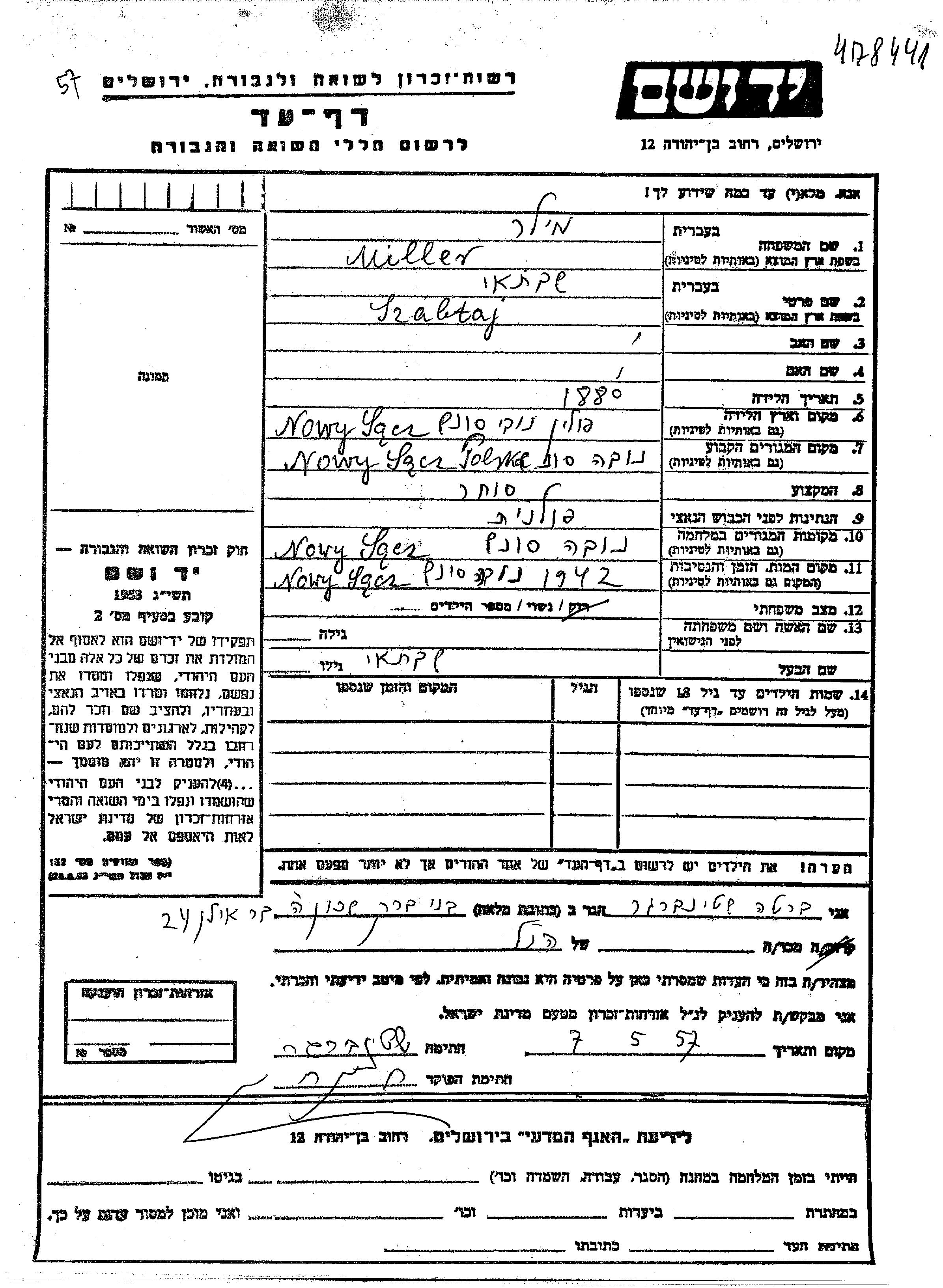 Шабтай Миллер, место рождения: Новы-Сонч, Польша. Торговец / торговка. Женат / замужем. Место жительства до войны: Новы-Сонч, Польша. Место во время войны: Новы-Сонч, Польша.