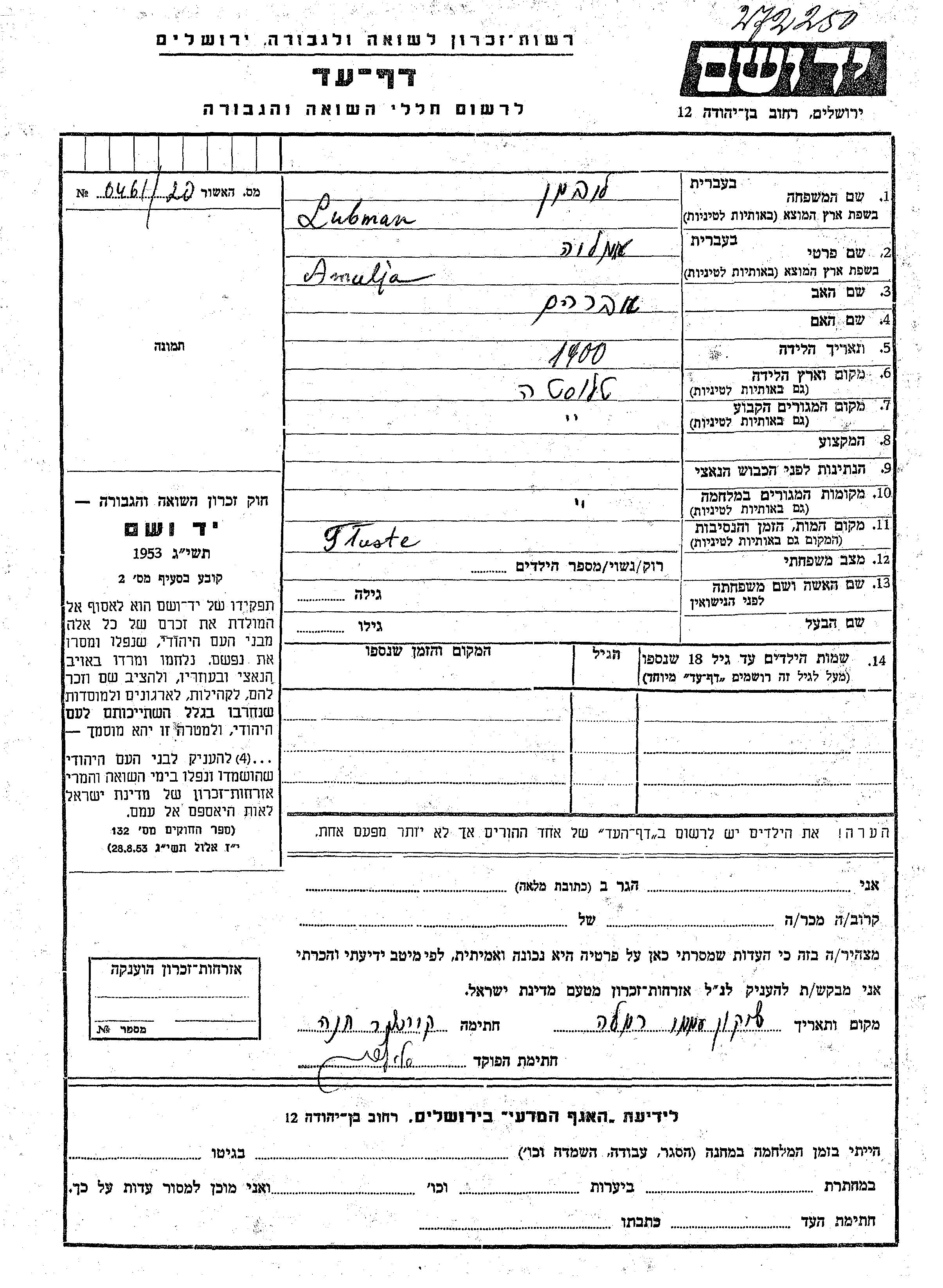 Яд Вашем - Листы свидетельских показаний Мемориального фонда