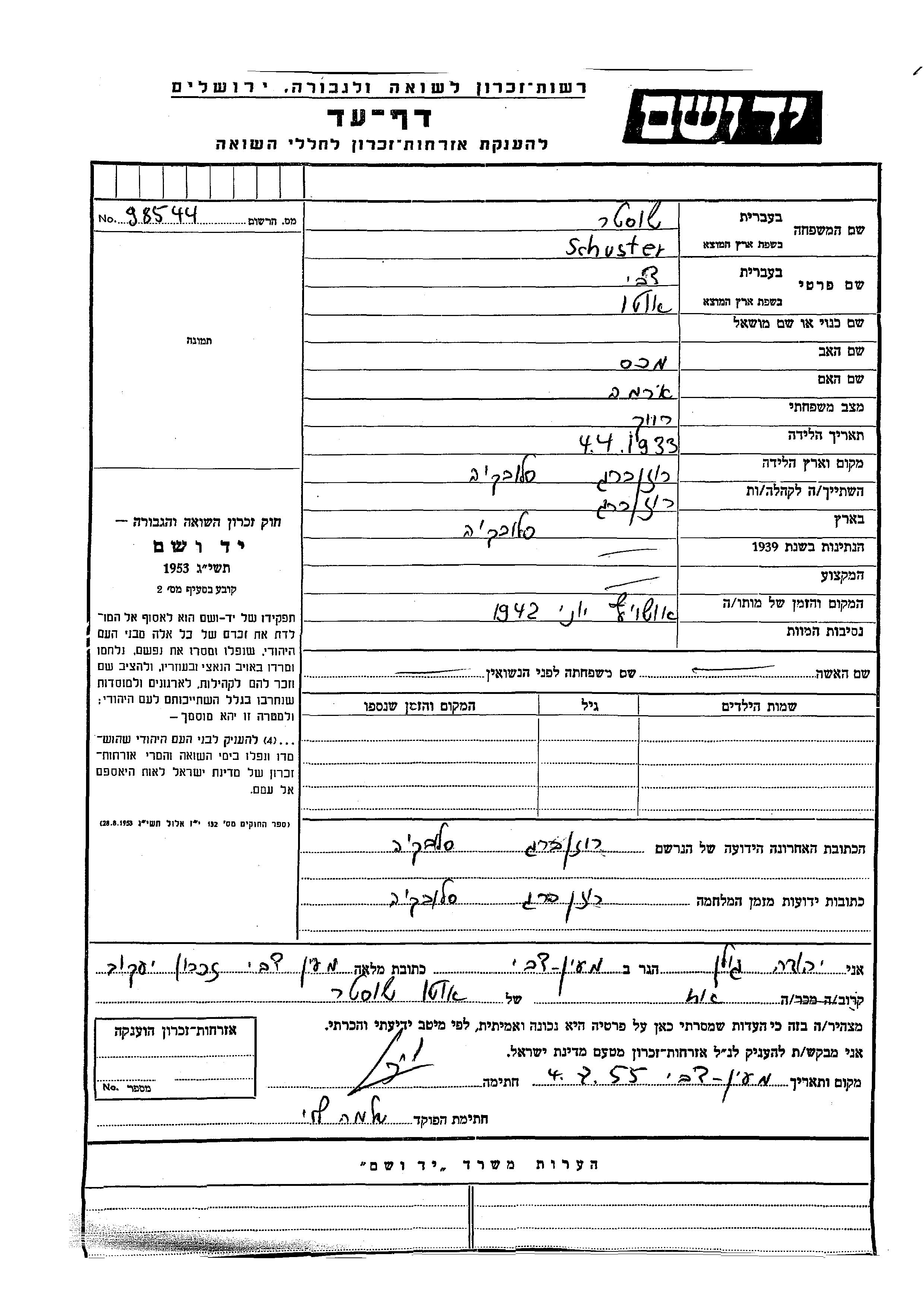Цви Ото Шустер, место рождения: Розенберг, Чехословакия. Отец: Макс, mать:Ирма. Холост / не замужем. Место жительства до войны: Розенберг, Чехословакия. Место во время войны: Розенберг, Чехословакия.