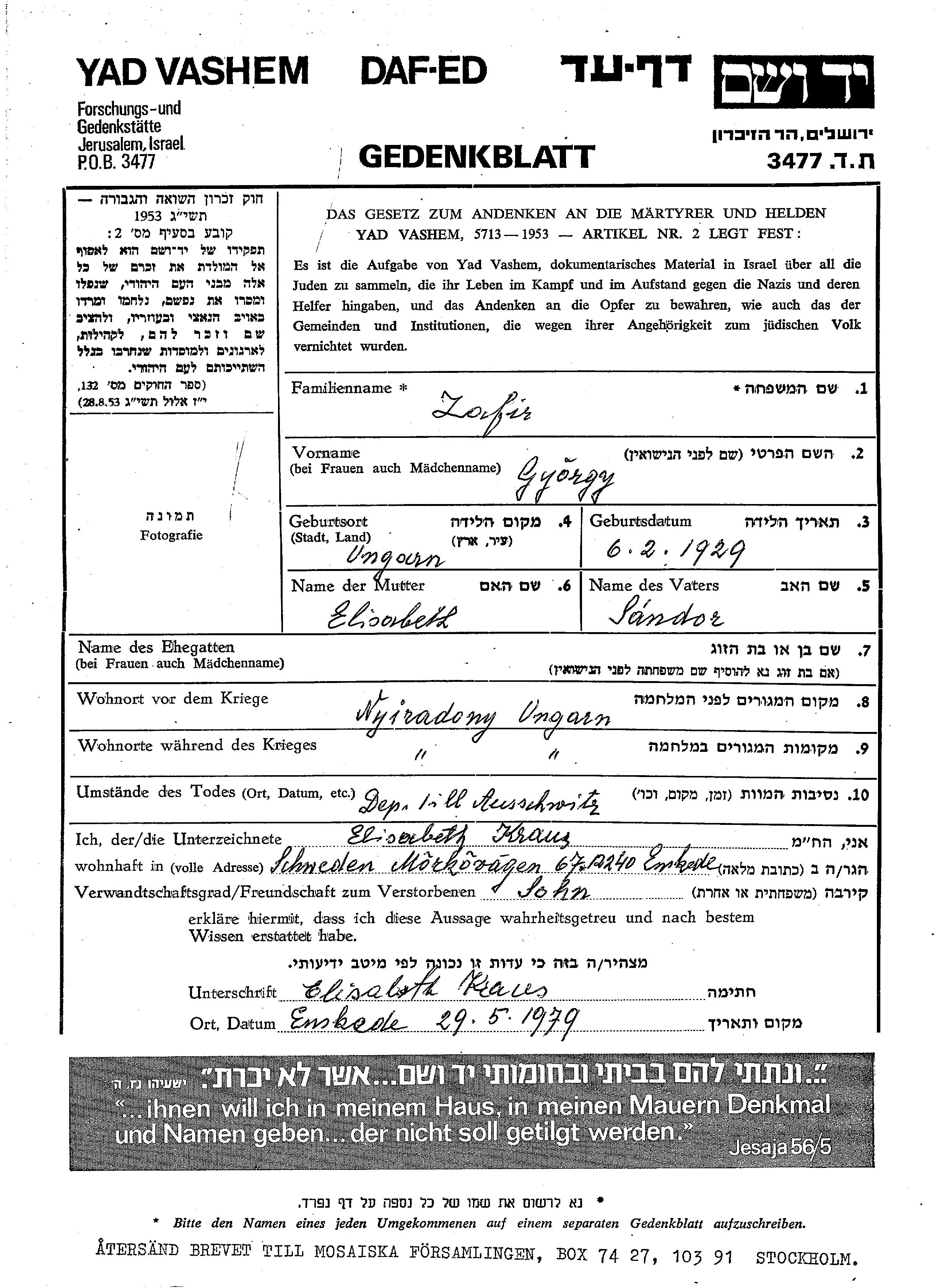Зофир Дьёрдь 1929 Ньирадонь, Венгрия Лист свидетельских показаний