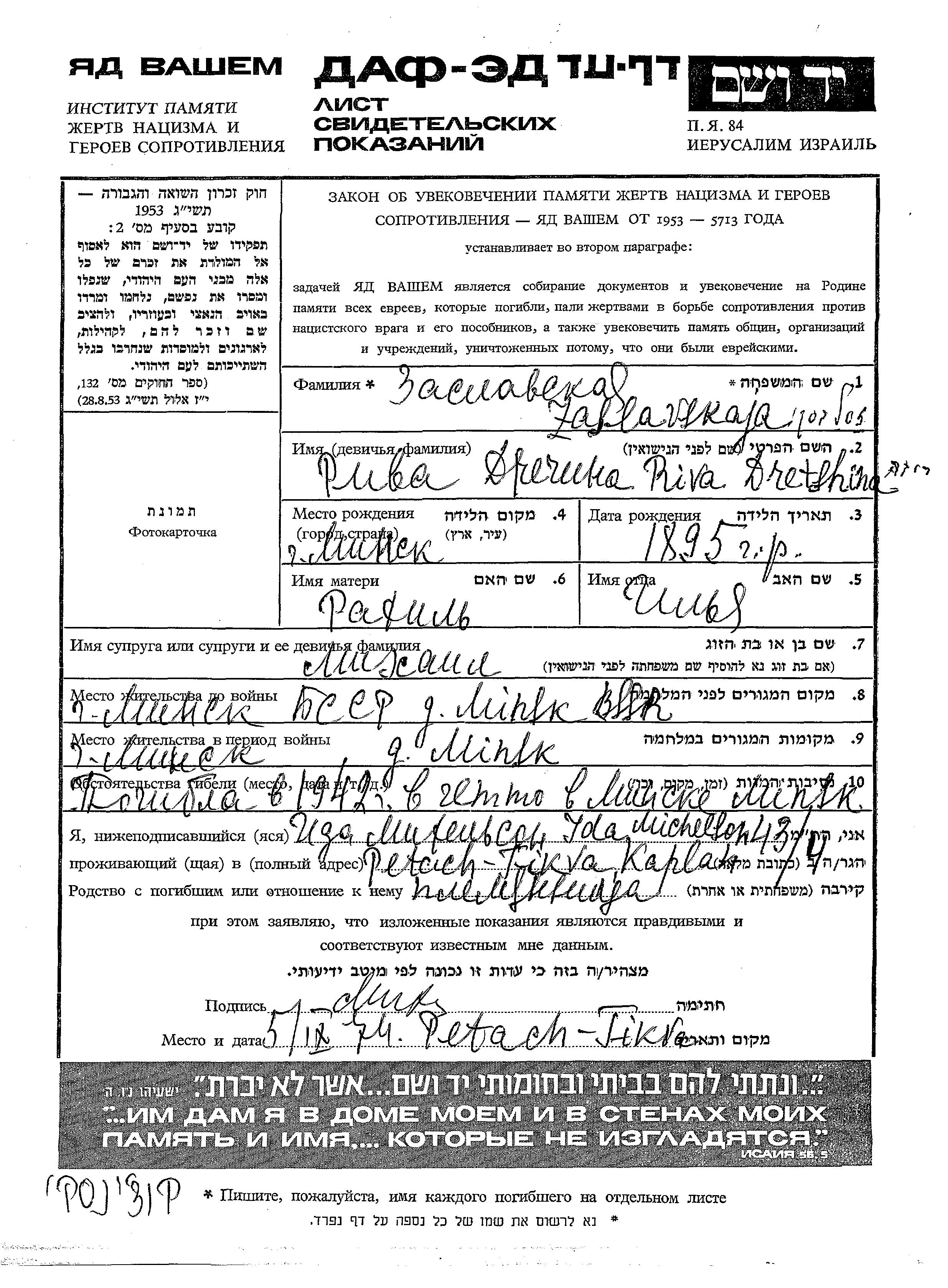 Заславски Рива 1895 Минск, Белоруссия (СССР) Лист свидетельских показаний