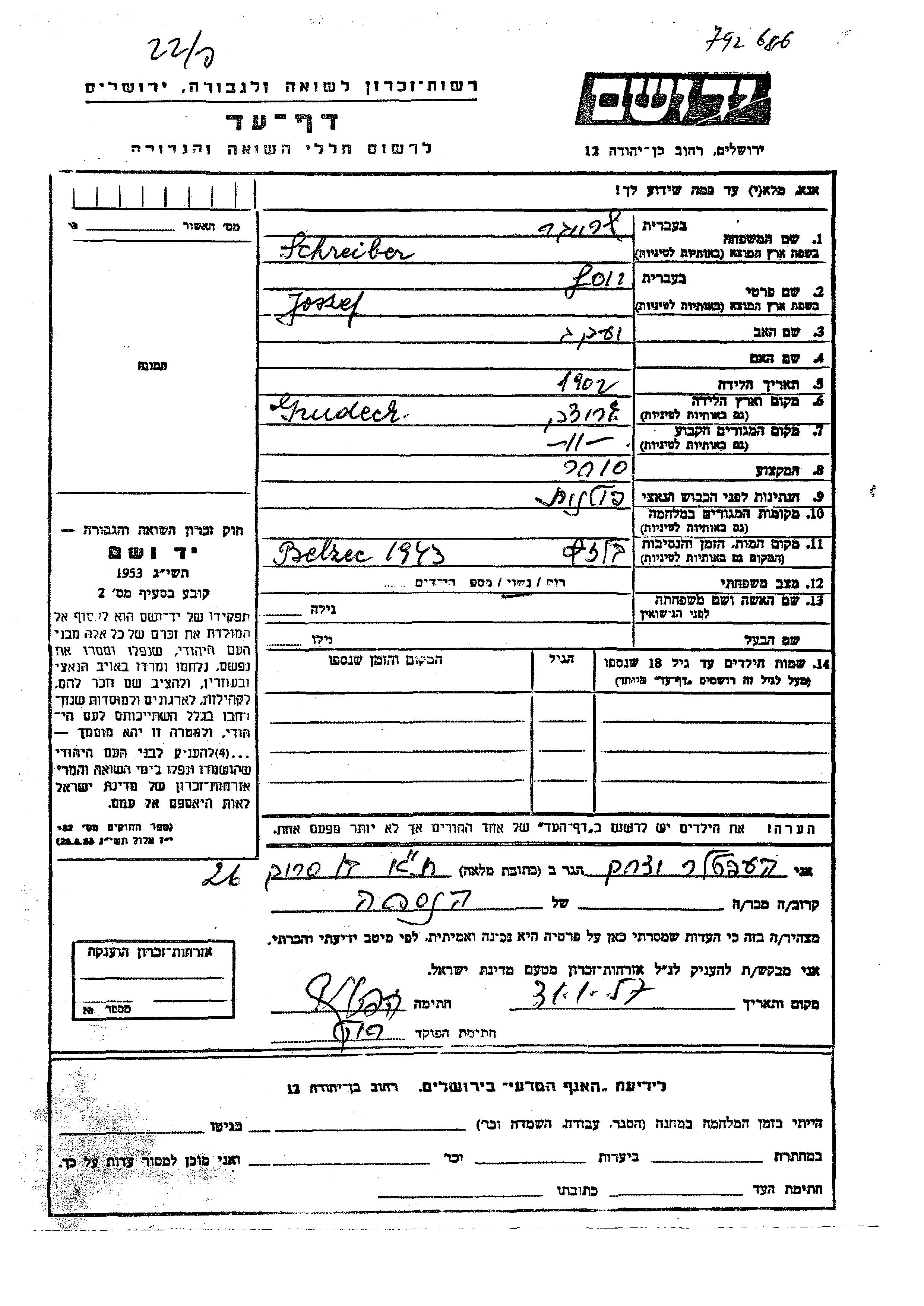 Йосеф Шрайбер, место рождения: Грудек-Ягелонский, Польша. Отец: Яков. Торговец / торговка. Женат / замужем. Место жительства до войны: Грудек-Ягелонский, Польша.