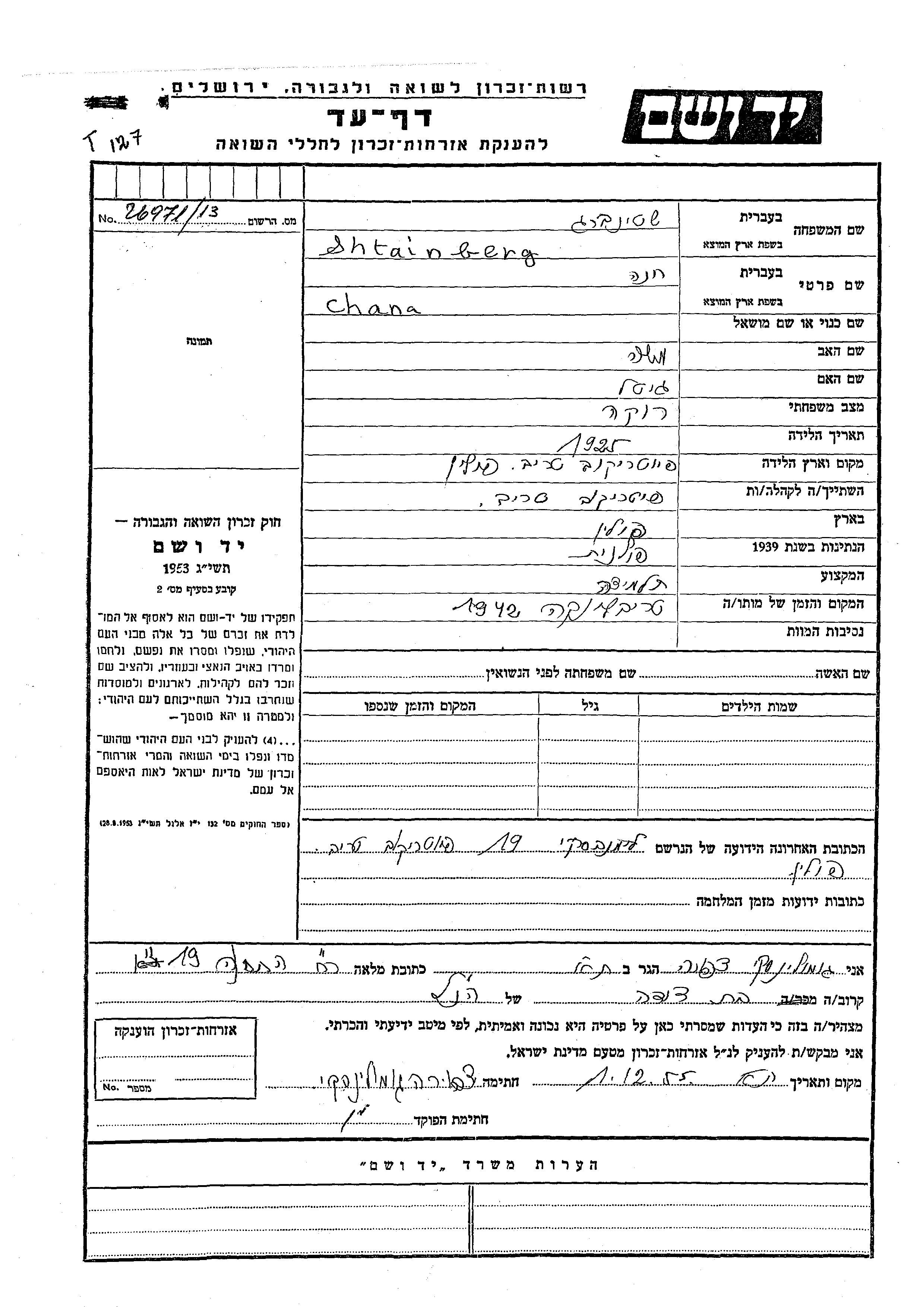 Хана Штайнберг, место рождения: Пётркув-Трыбунальски, Польша. Отец: Моше, mать:Гитель. Ученик / ученица. Холост / не замужем. Место жительства до войны: Пётркув-Трыбунальски, Польша.