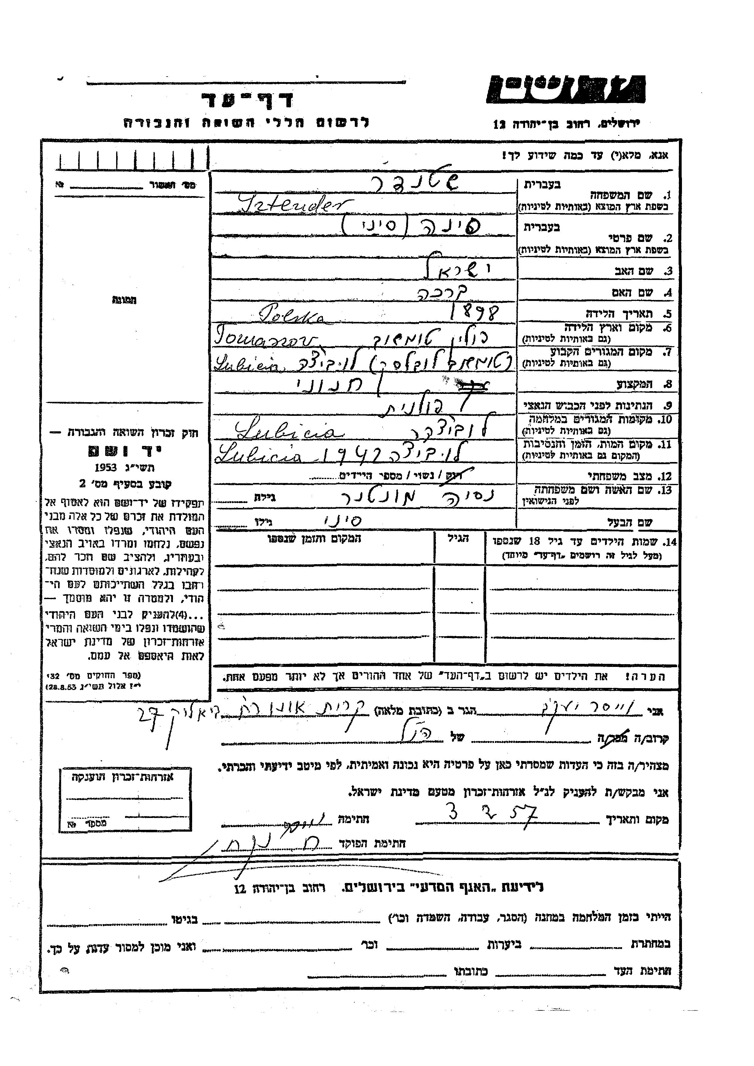Пина Синай Штендер, место рождения: Томашув, Польша. Отец: Исраэль, mать:Браха. Бакалейщик / бакалейщица. Женат / замужем. Место жительства до войны: Любица, Чехословакия. Место во время войны: Любица, Чехословакия.