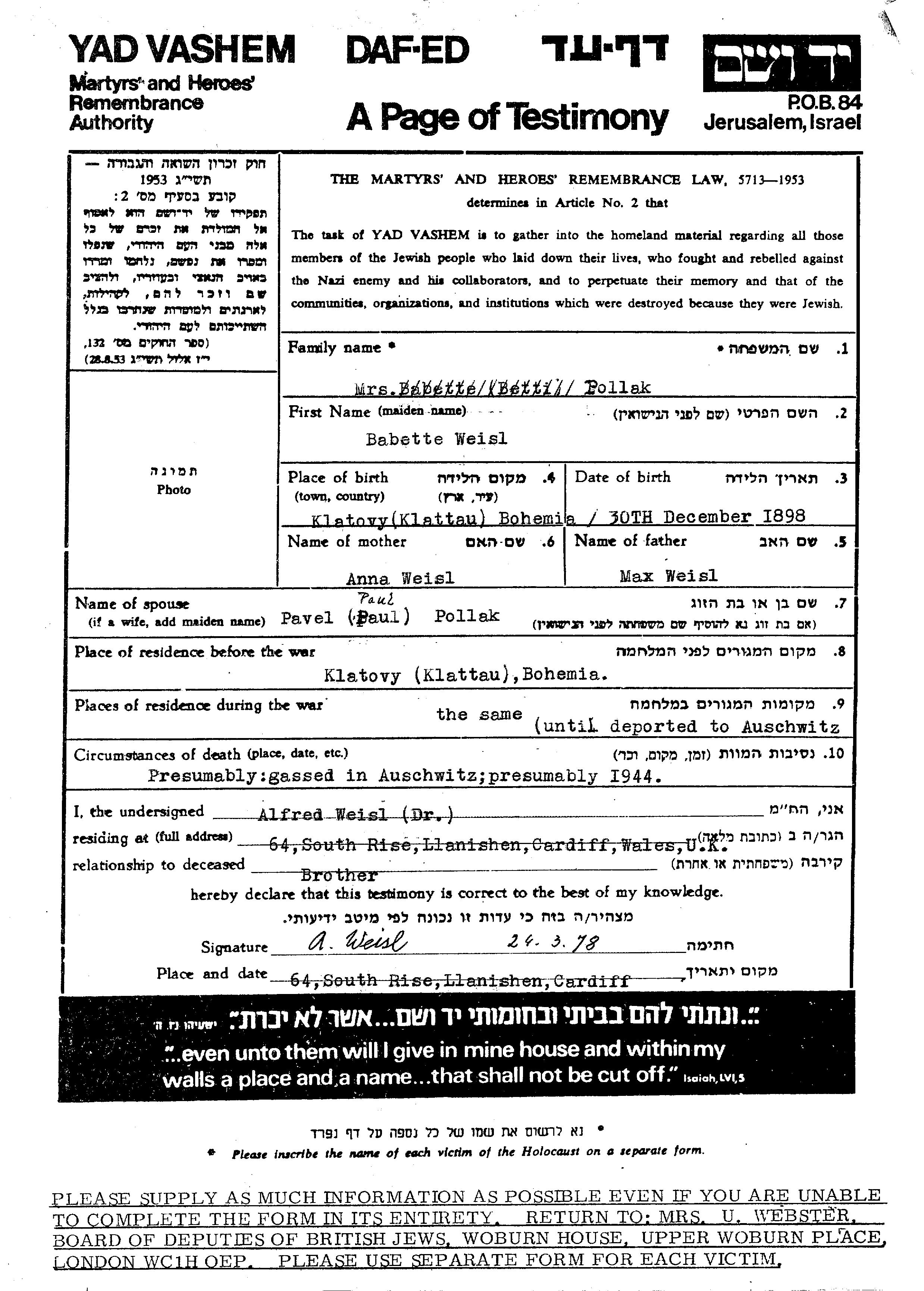 Бабетт Бетти Поллак, девичья фамилия Вайзль, место рождения: Tupadly, Чехословакия. Отец: Макс, mать:Анна. Женат / замужем. Место жительства до войны: Tupadly, Чехословакия. Место во время войны: Tupadly, Чехословакия.