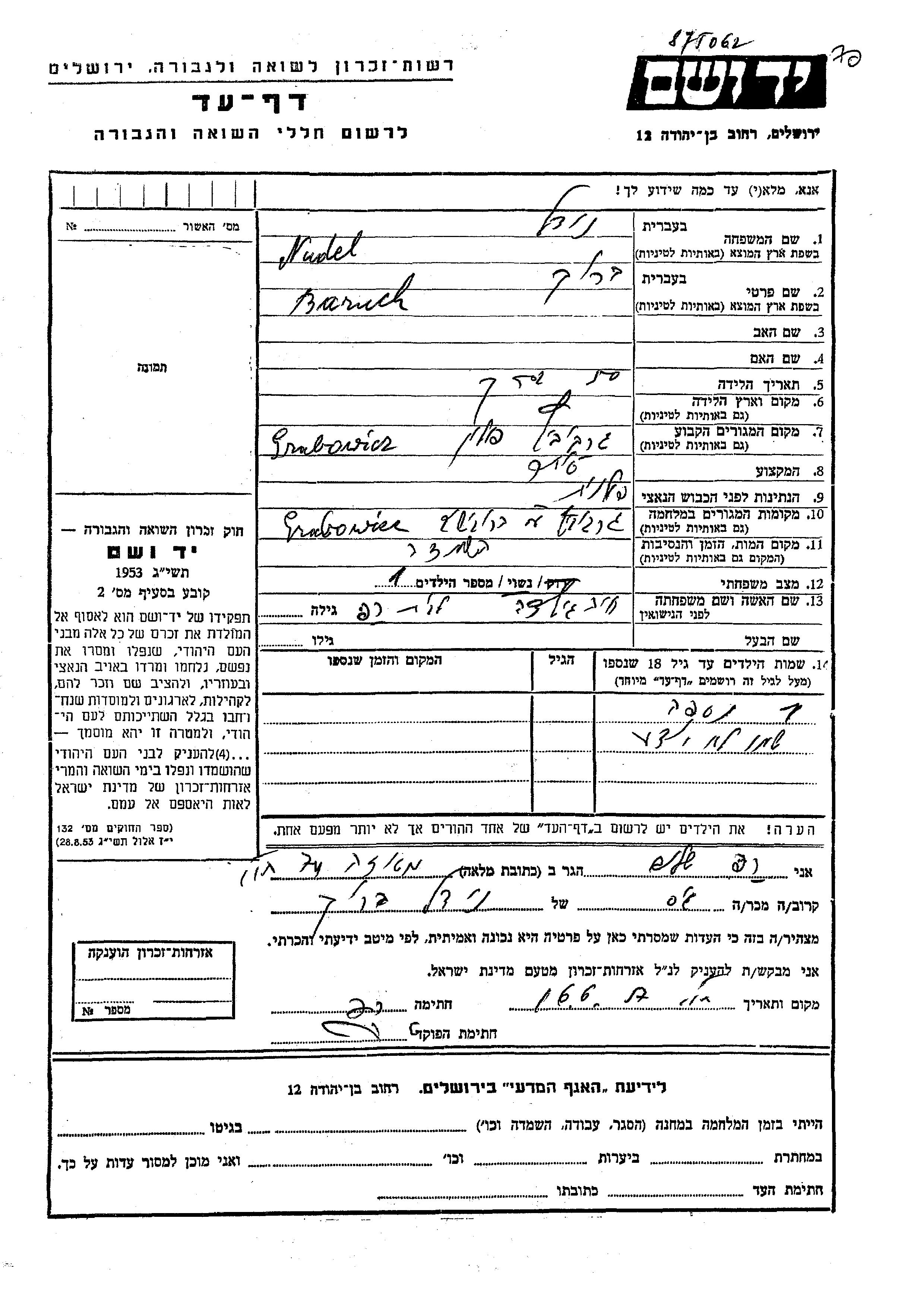 Нудель Барух Грабовец, Польша Лист свидетельских показаний