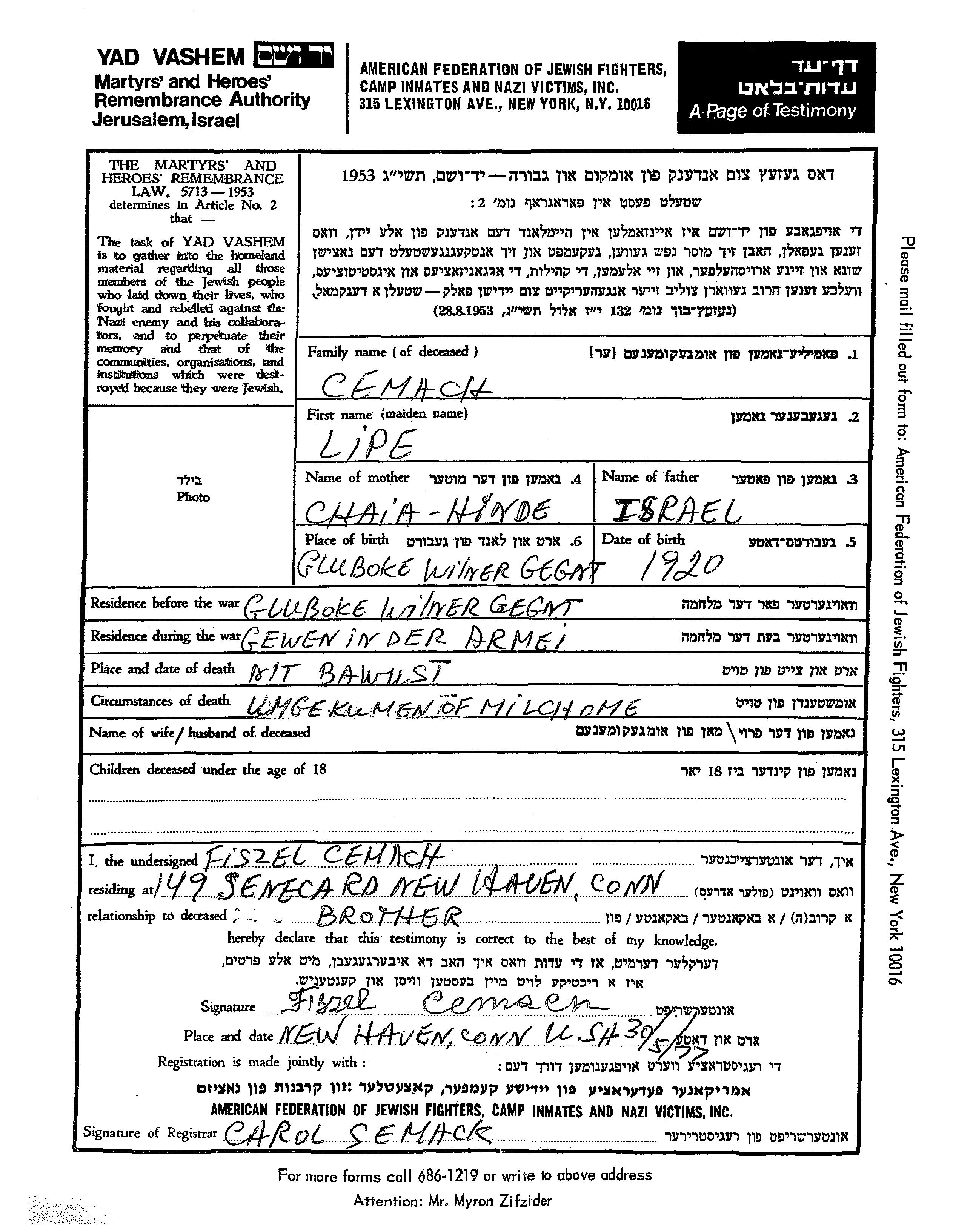Липе Цемах, место рождения: Глубок, Польша. Отец: Исраэль, mать:Хая Хинде. Холост / не замужем. Место жительства до войны: Глубок, Польша.