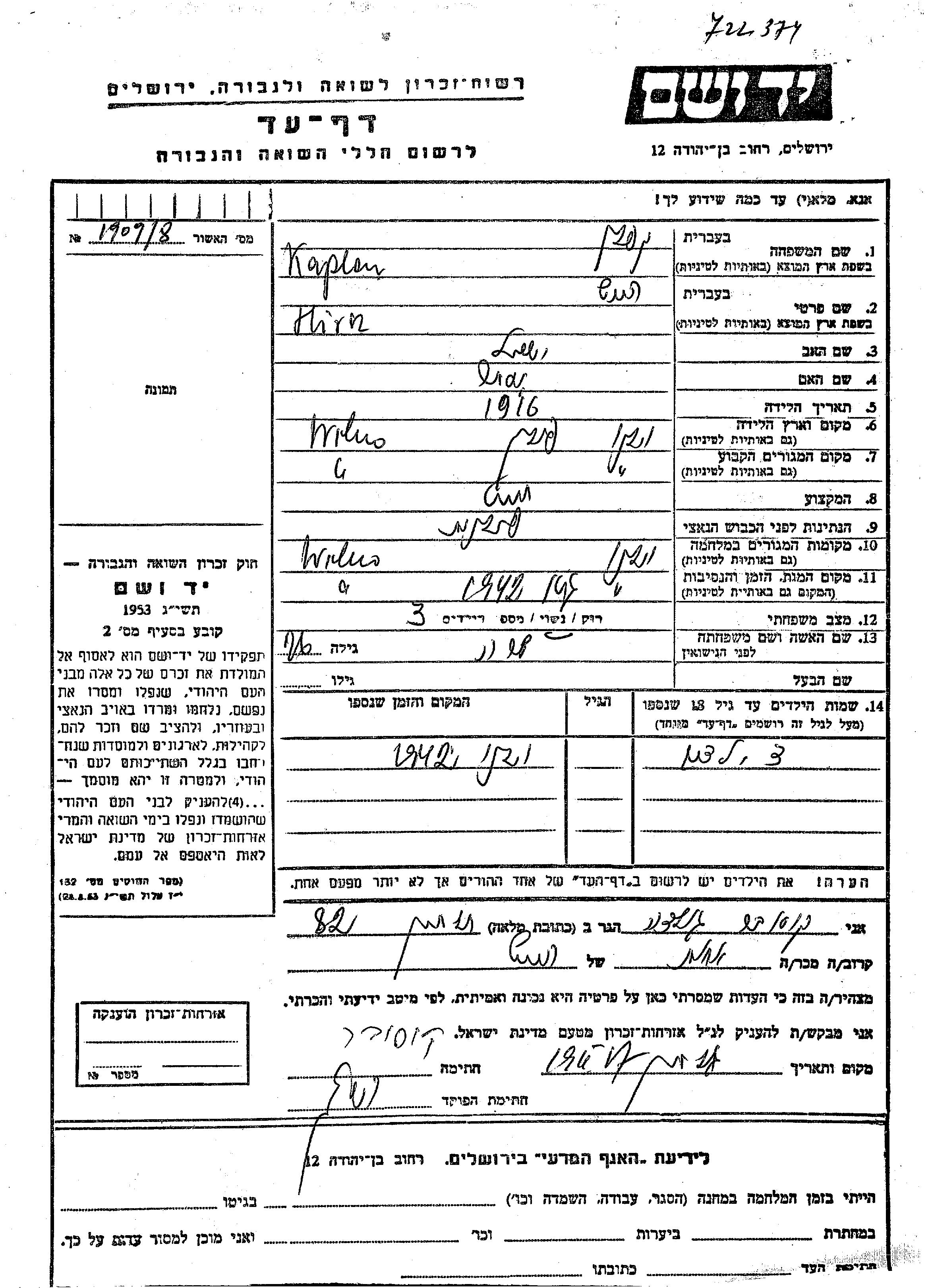 Каплан Хирш 1916 Вильно, Польша Лист свидетельских показаний
