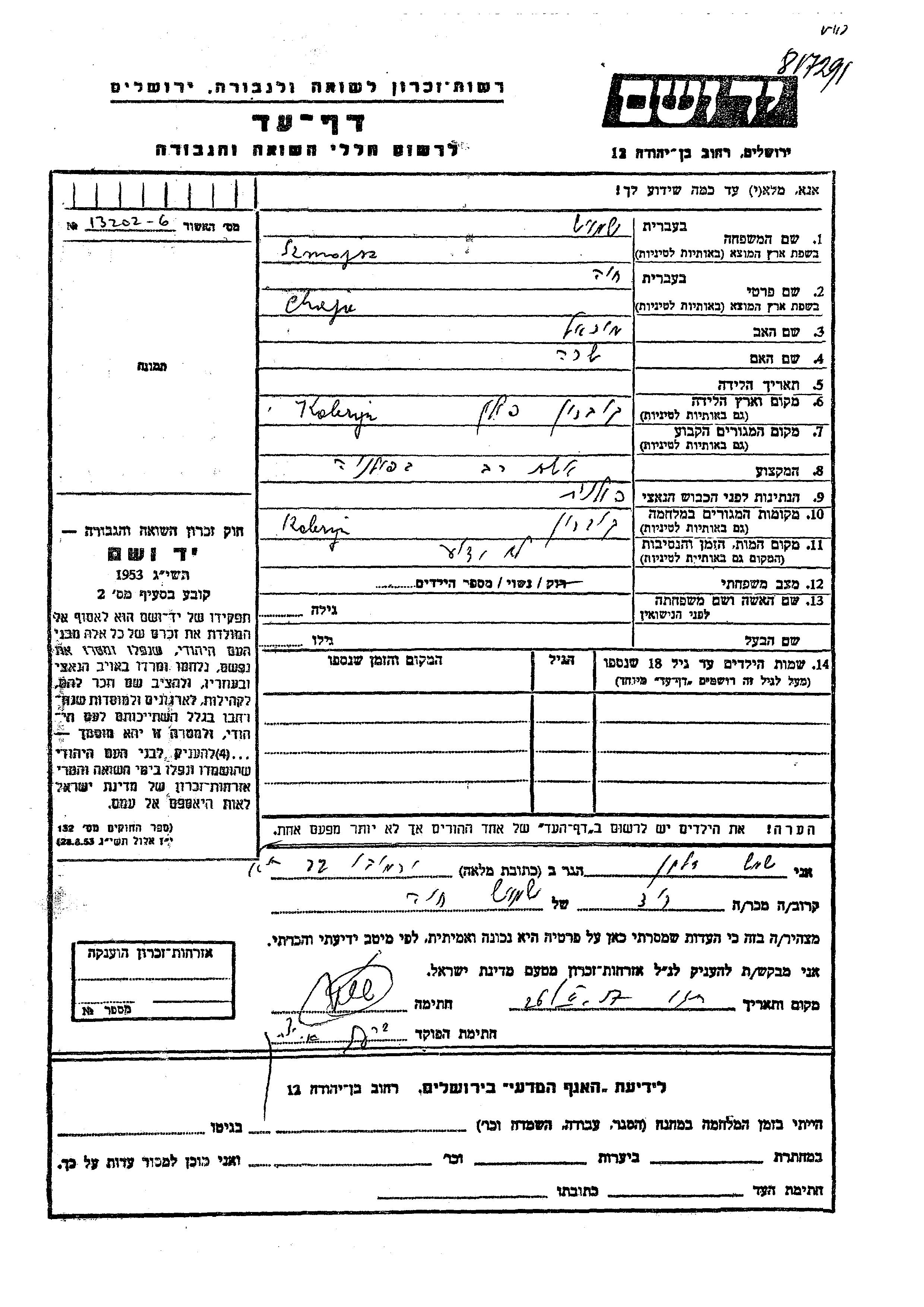 Хая Шмойш, место рождения: Кобрынь, Польша. Отец: Михаэль, mать:Сара. Супруга раввина. Женат / замужем. Место жительства до войны: Кобрынь, Польша. Место во время войны: Кобрин, Польша.