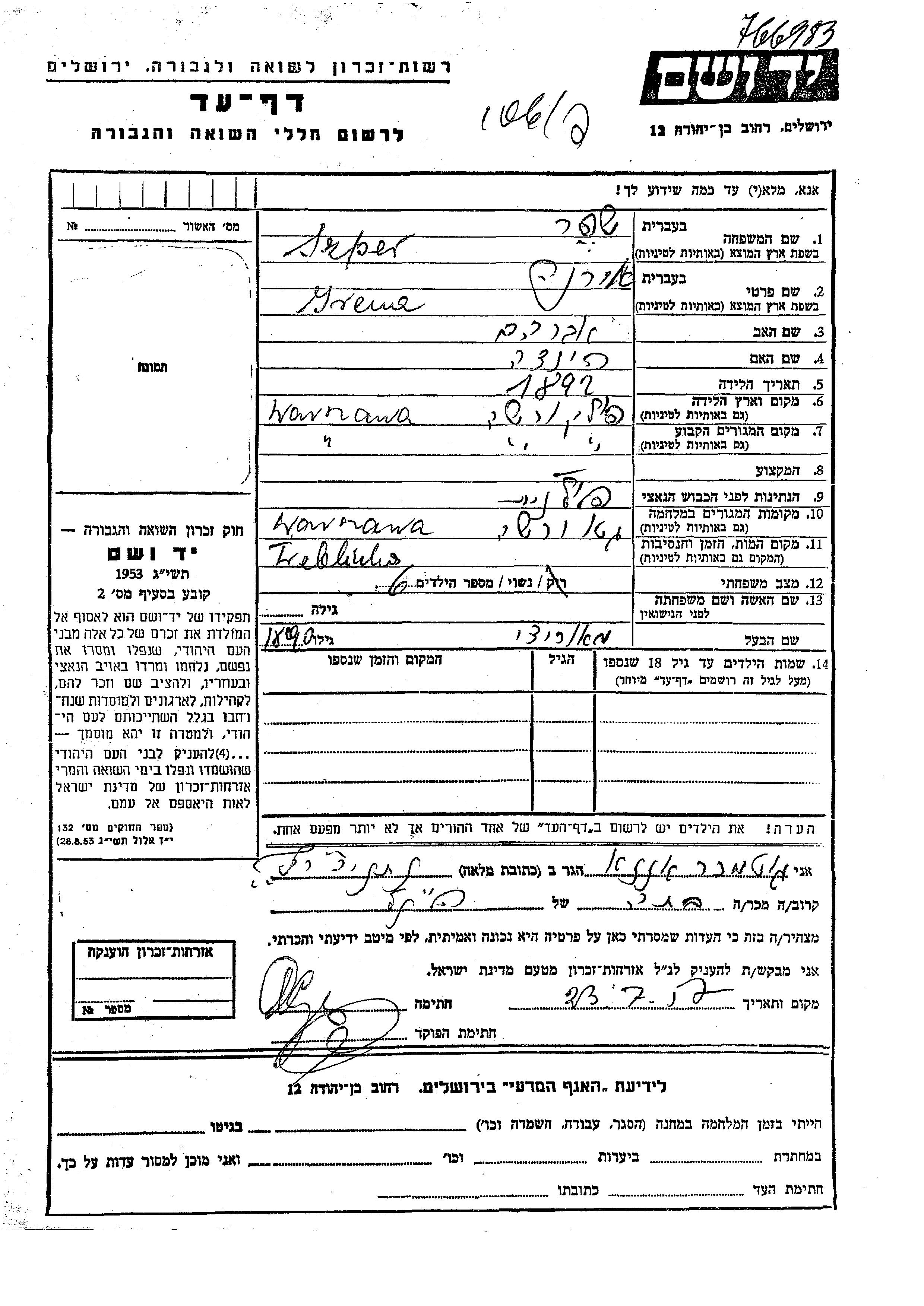 Ирена Шпер Шефер, место рождения: Варшава, Польша. Отец: Авраам, mать:Хинда. Женат / замужем. Место жительства до войны: Варшава, Польша. Место во время войны: Варшава, Польша.