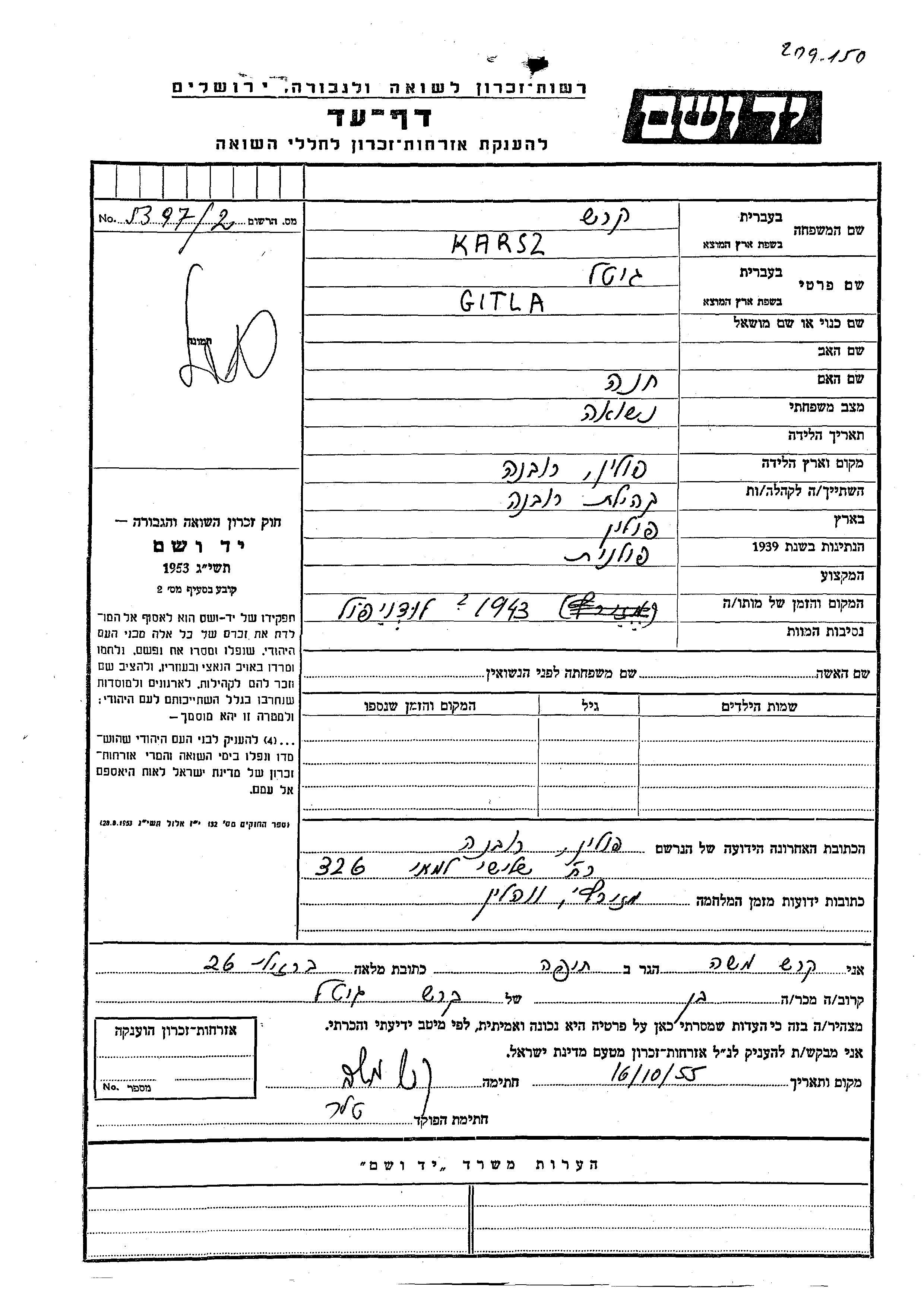 Гитла Карш Керш, место рождения: Ровно, Польша.Mать:Хана. Женат / замужем. Место жительства до войны: Ровно, Польша. Место во время войны: Мендзыжеч Волынь, Польша.