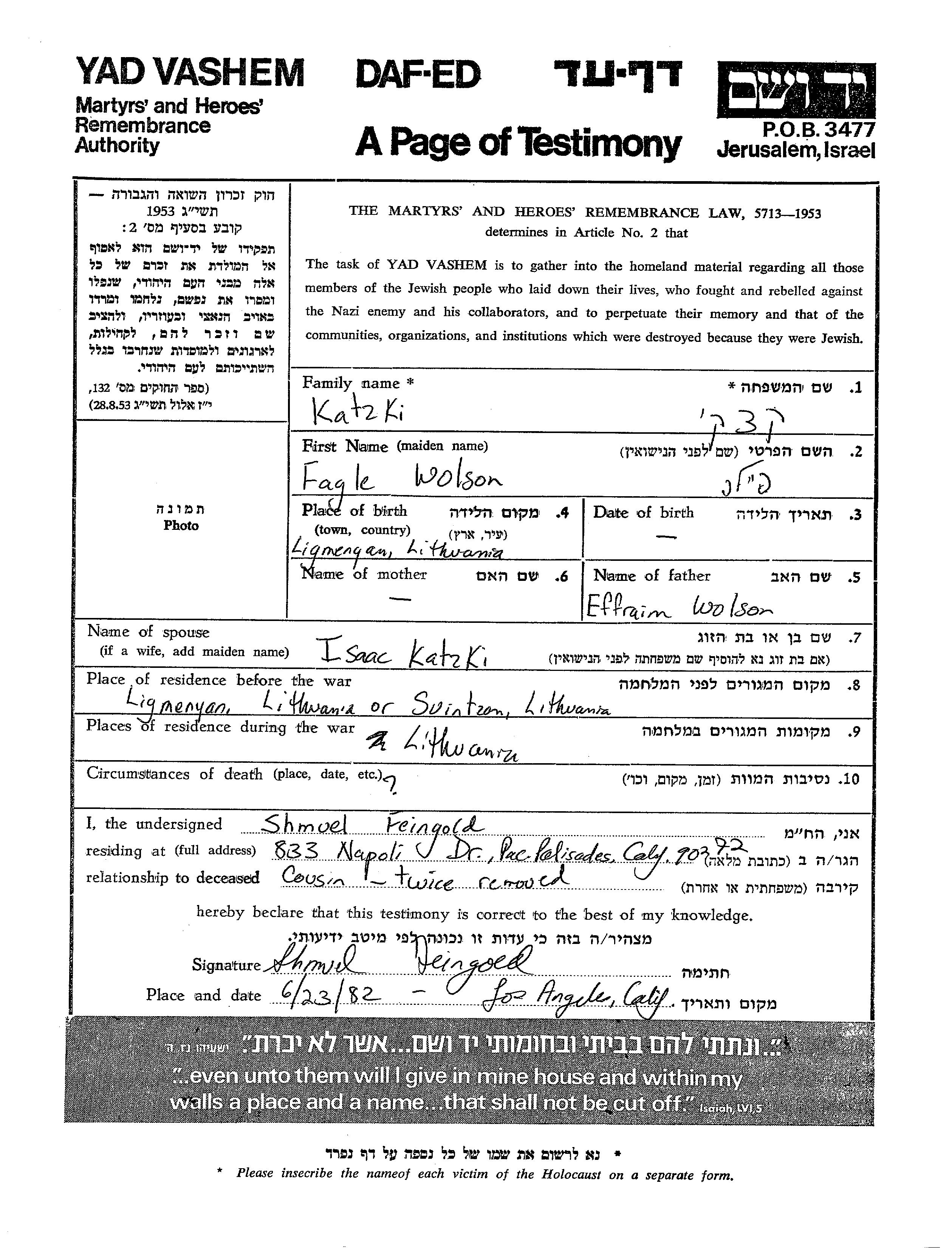 Фагле Файла Кацки, девичья фамилия Вользон, место рождения: Лынгмяны, Польша. Отец: Эфраим. Женат / замужем. Место жительства до войны: Свечаны, Польша. Место во время войны: Литва.