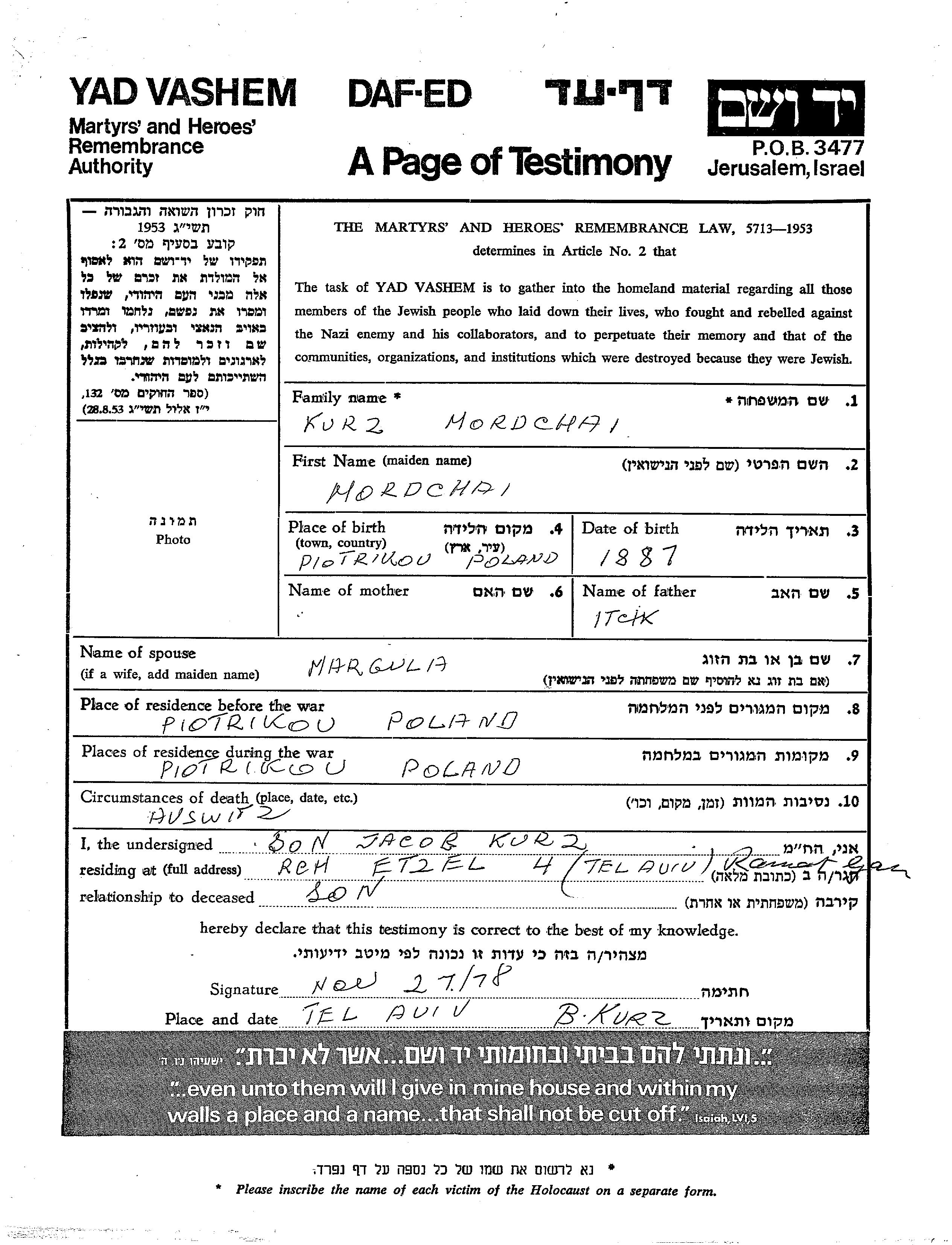 Мордхай Курц, место рождения: Пётркув, Польша. Отец: Ицик. Женат / замужем. Место жительства до войны: Пётркув, Польша. Место во время войны: Пётркув, Польша.